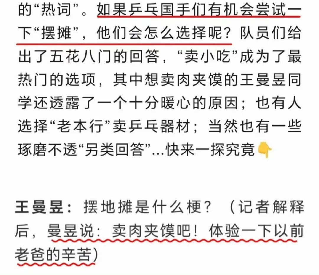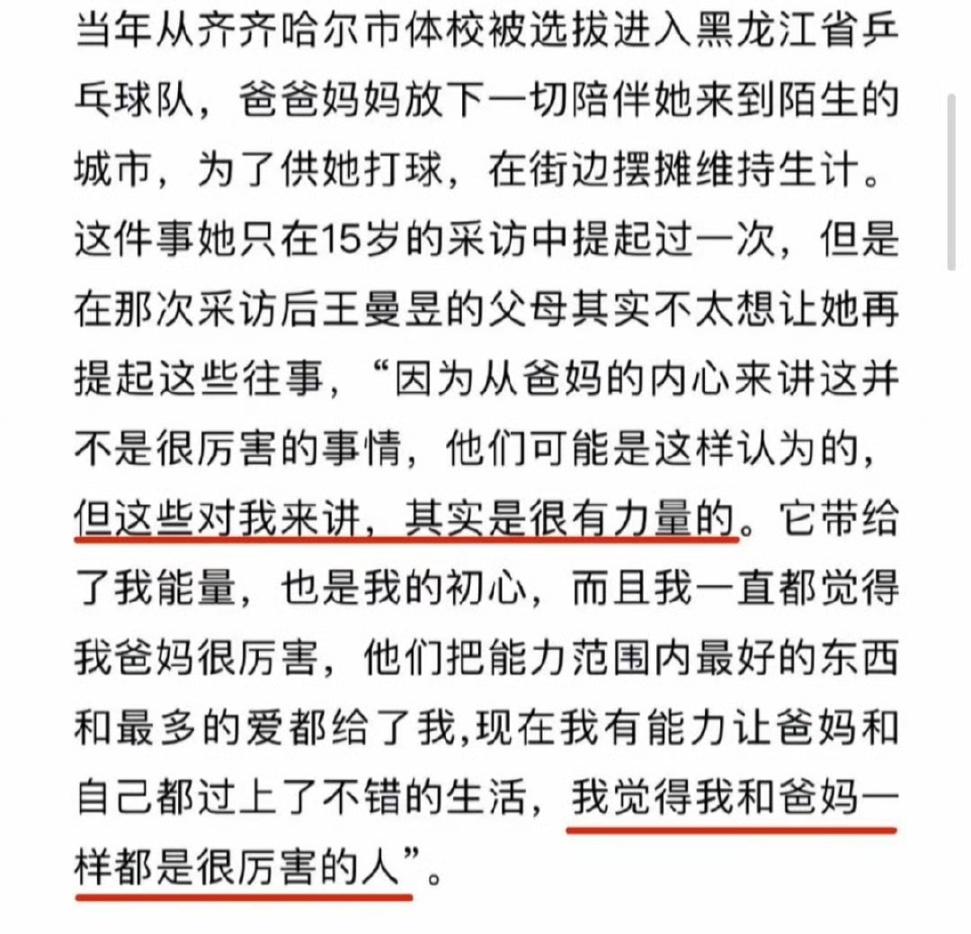王曼昱从未觉得自己父亲卖肉夹馍养家糊口是需要被瞧不起的事情!反而觉得父母靠摆摊维持生计托举小时候的自己学打乒乓球,是非常厉害了不起的父母!