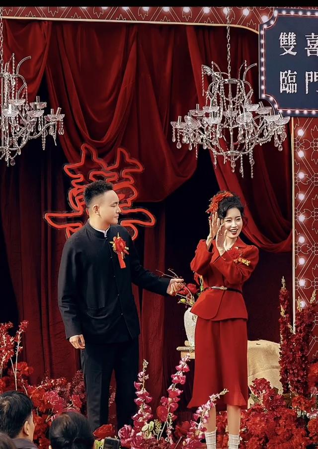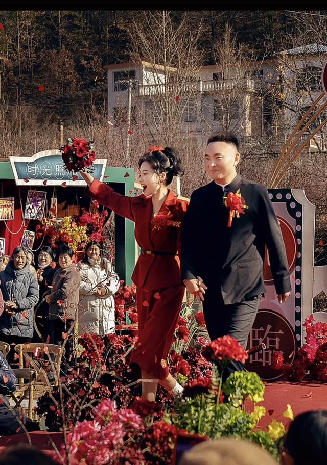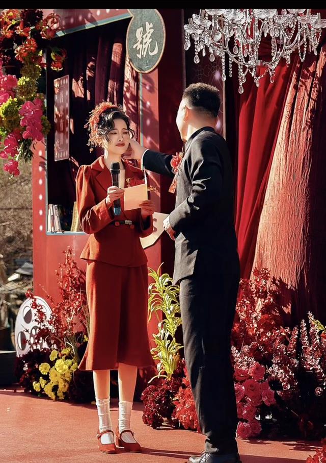 这对新人没有选择当下最流行的西式婚礼,而是选择复古的中式婚礼,风格是70,80年代风,也就是我们妈妈辈结婚时的风格,新娘是大红色的礼服,头发简单挽起戴红花,而新郎是中山服。