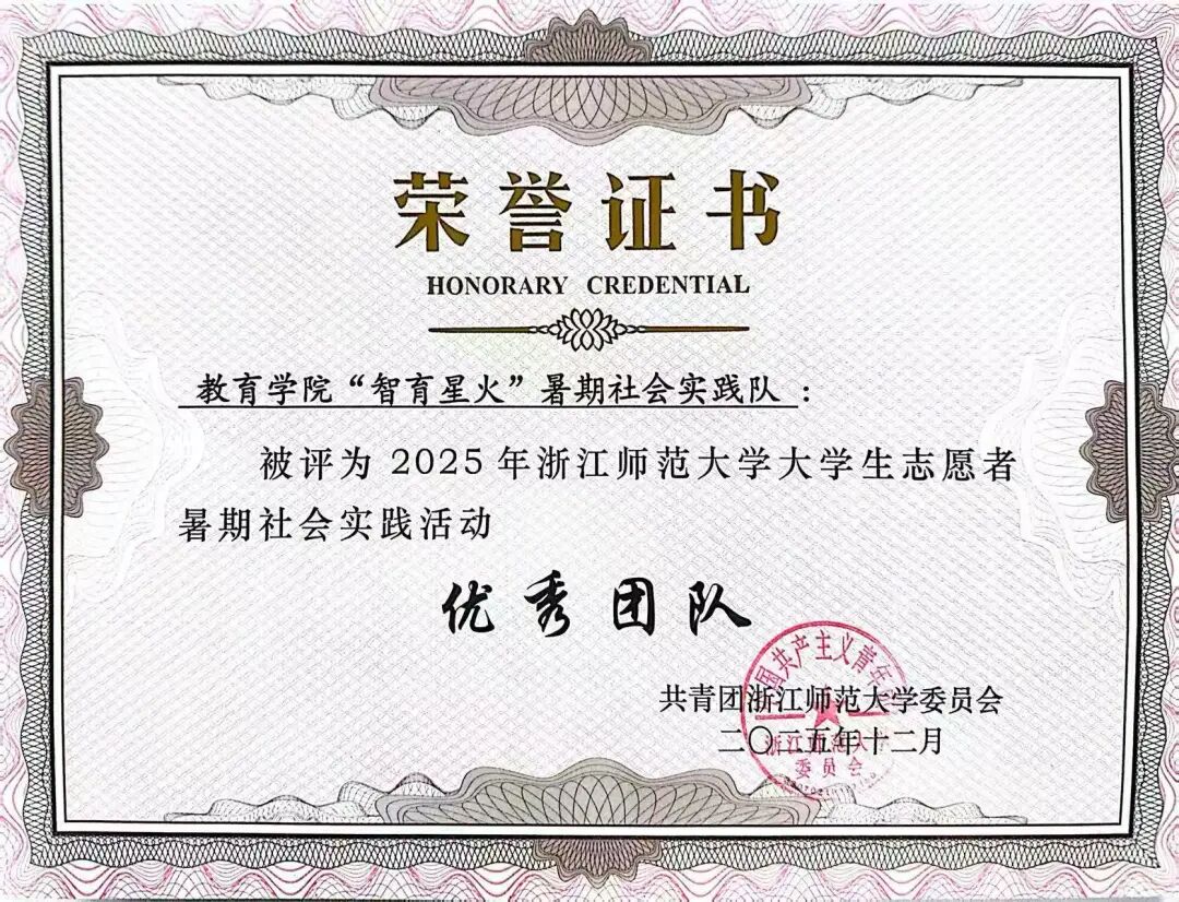 智育星火,造创浙江。近日,浙江师范大学教育学院“智育星火”暑期社会实践队,被评为2025年浙江师范大学大学生志愿者暑期社会实践活动“优秀团队”。