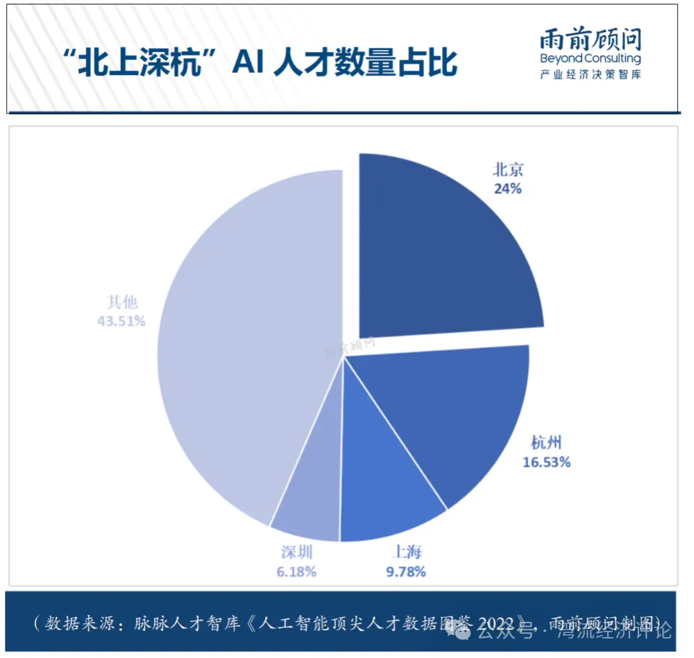 第三是人才数量,决定了AI产业能走多远。北上深杭4地AI人才数量占比分别为24%、9.78%、6.18%和16.53%。也就是说,杭州一个城市的AI人才数量,相当于上海和深圳两地的总和。还有一个比较有意思的数据是,2022年深圳42.85万研发人员中,华为和腾讯就占了45%左右。都说大厂卷,都往大厂跑。人才都去大厂打螺丝,硬生生错过一个个DeepSeek的诞生。