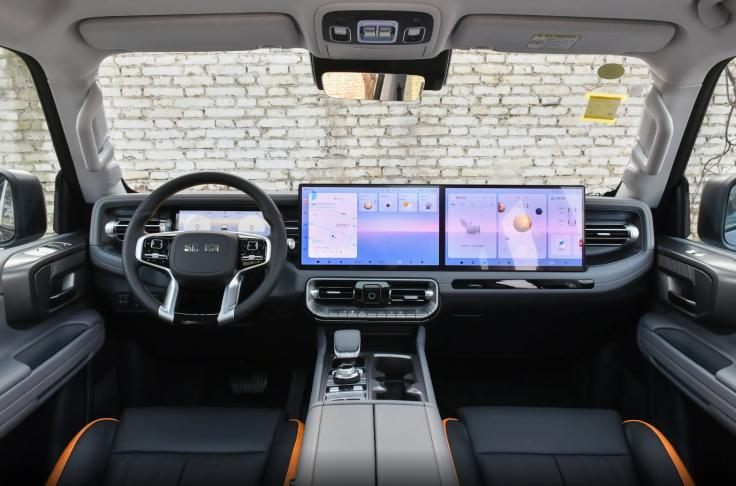 聚焦座舱内部,这是此次新款北京BJ40巨幕版主要升级的地方,新车取消了传统的仪表盘和中控屏布局,从入门款开始标配同级别少见的双15.6英寸悬浮式贯穿屏,并搭载二代骁龙8155芯片,操作流畅度和科技感都实现了大幅提升。同时车机系统支持应用商店下载安装第三方车机软件,新增无线CarPlay车机互联映射,并内置了新版高德地图和AI大模型,智能化车机水平向主流新能源车看齐。