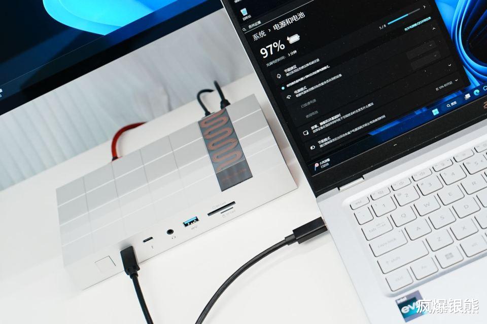 磐镭Link G2E扩展坞的雷电5接口除了支持超高的传输速度外,其还支持140W的PD反向供电,以笔者的笔记本为例,插上扩展坞后,笔记本自动就开启了充电模式,有出差需求的小伙伴平时出差完全可以省略电源适配器。140W即使是游戏笔记本也能轻松应对。