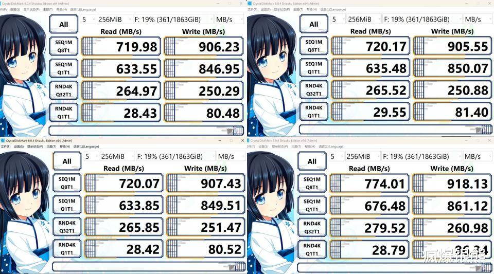 首先是4个USB-A接口,用CrystalDiskMark分别进行读写测试,成绩如上图,虽然达不到最高10Gbps的速度,但是读取700+MB/s,写入900+MB/s的速度,也没啥毛病可挑。