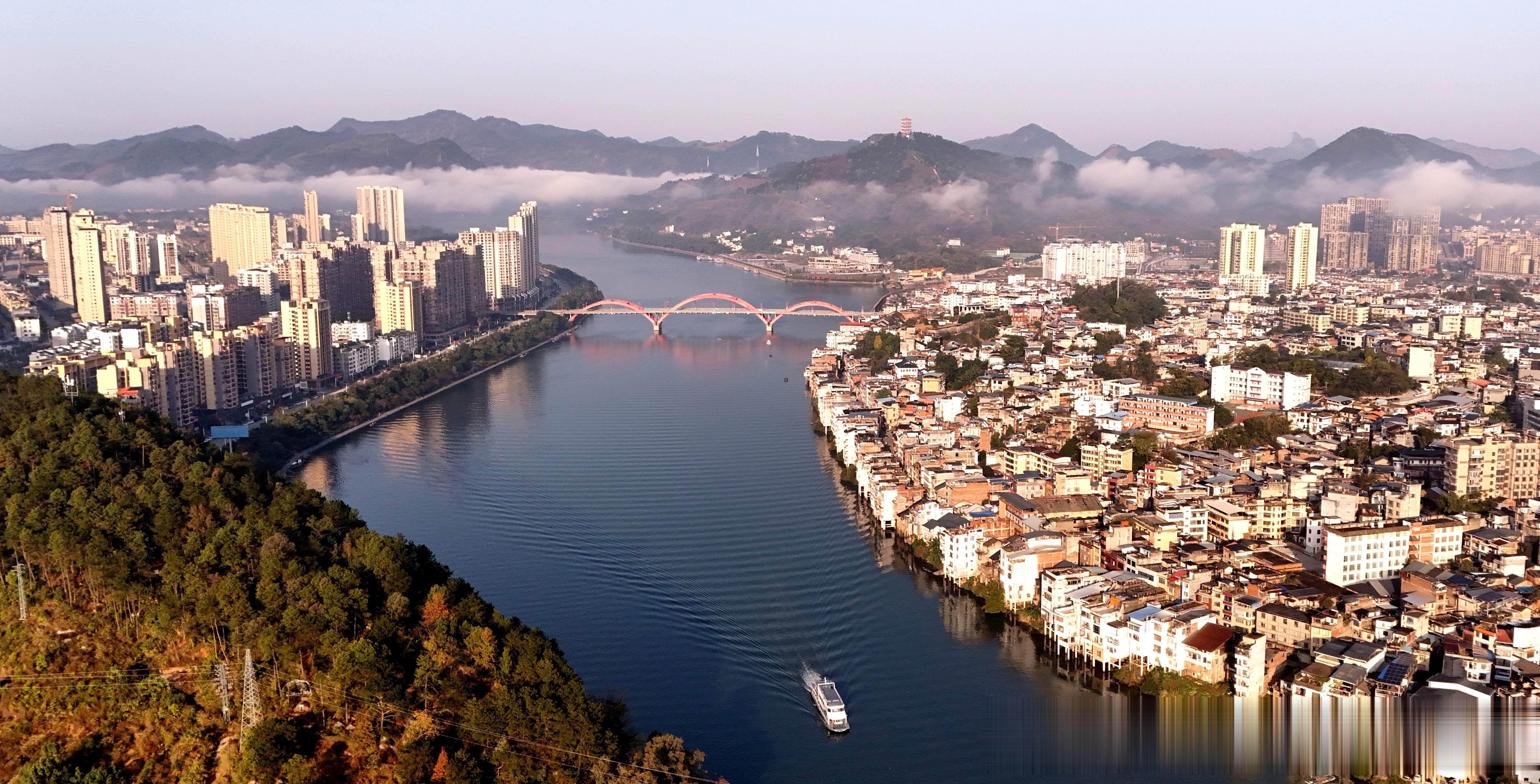 晨雾在茶江江面流转,与连绵的青山黛影,江面的红桥栏杆,将岸边鳞次栉比的现代楼宇晕成水墨剪影。