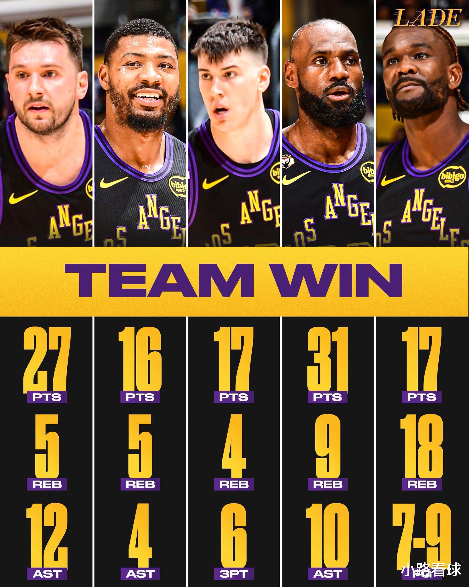 此外,这场比赛湖人全队的状态都有所回暖,投篮83投48中,命中率57.8%,三分球34投19中,命中率55.9%。全队5人得分上双,詹姆斯31分9篮板10助攻1抢断1盖帽,东契奇27分5篮板12助攻,艾顿17分18篮板,拉拉维亚17分4篮板3助攻,斯玛特16分5篮板4助攻,文森特10分1篮板1助攻,正如湖人名宿罗伯特·霍里在赛后所说:“这场比赛很好地展现了湖人如果能转移球、不依赖单打独斗时能做到什么,这就是为什么这被称为团队运动。转移球,让每个人都参与进来。”