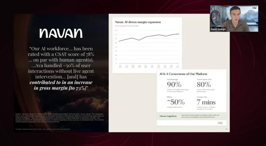 Navan 是另一种类型的案例,正好能印证我刚才说的观点。它们很早就启动 AI 转型,投入大量精力充分利用 AI 能力优化业务。目前最直观的体现是问题处理环节:它们的业务涉及旅行预订、行程变更等,现在 AI 已经能处理 50% 的用户交互。