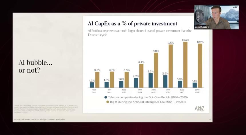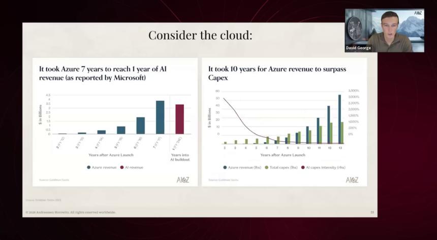 我认为这一次也会一样。和互联网泡沫时期的资本开支相比,本轮开支有现金流支撑,资本开支占营收比例也更低。超大规模云厂商承担了绝大部分资本开支,这对我们的组合公司是极大的利好。我完全支持:尽可能多地建设算力基础设施,为训练和推理提供充足供给。