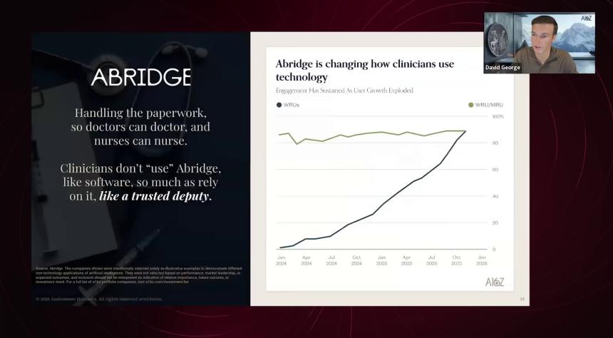 David George:这种高粘性、高价值的模式并非个例,我们在其他投资组合公司中也看到了同样令人振奋的图景。比如,医疗领域的 Abridge 就是一个很好的例子。医生们对这款产品赞不绝口,说它节省了大量时间,大幅改善了工作体验。有客户把它形容成“值得信赖的副手”。右侧图表是我们重点关注的指标:蓝线是用户增长,绿线是用户活跃度。