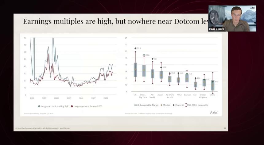 David George: 这些微观层面的效率提升,汇聚在一起,正在成为驱动宏观市场的核心动力。我们还看到,AI 相关科技巨头正在驱动公开市场,并贡献了标普 500 近 80% 的回报率,这是当前经济和股市的核心驱动力。公开市场表现很好,基本面也很扎实。股价在上涨,虽然最近几天有波动,但整体向好,基本面非常稳健。