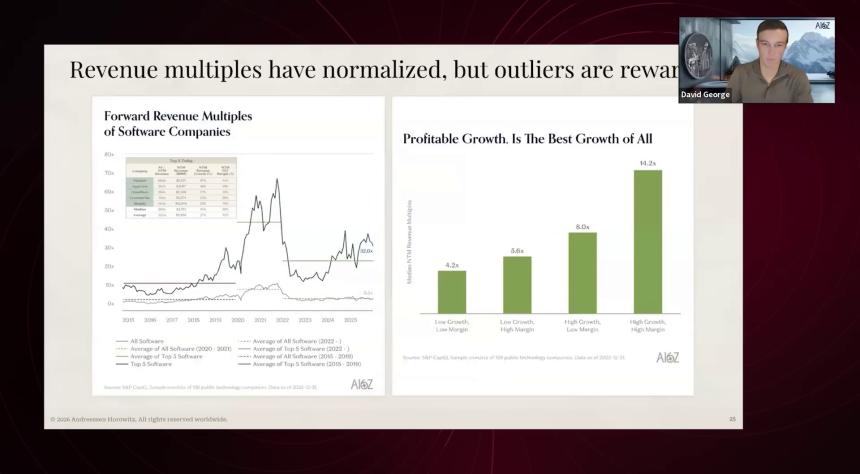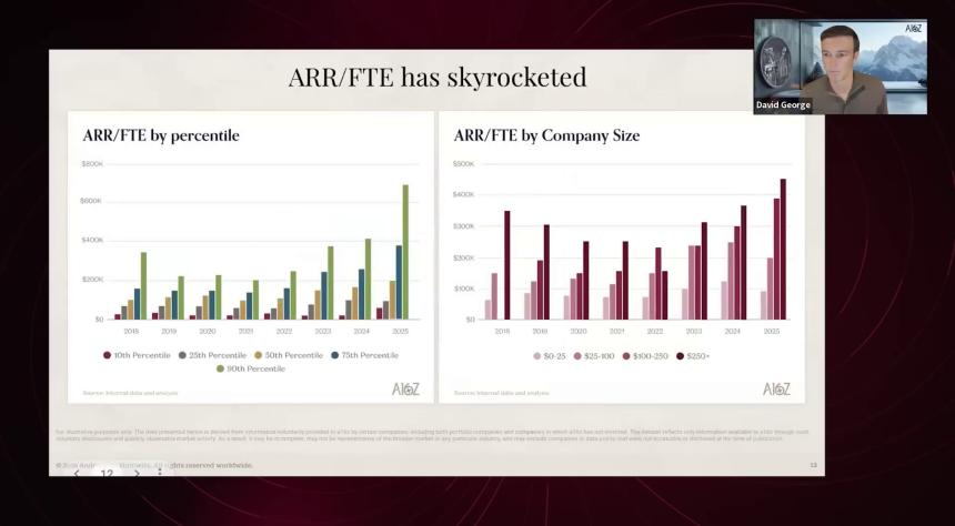在近期的一期播客中,他与 a16z 投资者关系主管 Jen Kha 就 AI 和私募科技市场的现状进行对话。David 分析了其成长期样本中,为什么 AI 公司的增长速度是传统软件公司的 2.5 倍,同时在销售和营销上的支出却显著减少——这得益于巨大的市场需求和创纪录的人均年度经常性收入(ARR,Annual Recurring Revenue)。