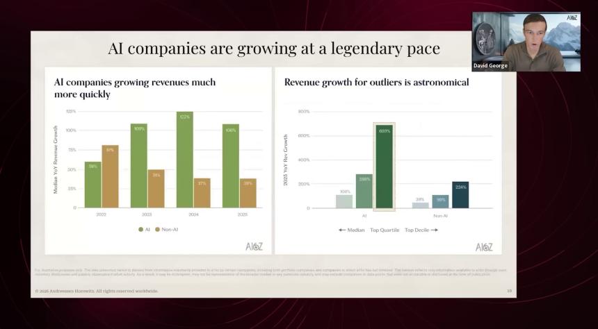 我们反复核对了数据:头部 AI 公司同比增长 693%,这与我们从投资组合公司观察到的情况完全吻合。这是我们从数据中看到的 Margin 模型。同样,这些都是我们内部的数据集,来自投资组合公司和潜在投资标的,而 AI 公司的毛利率会稍差一些。