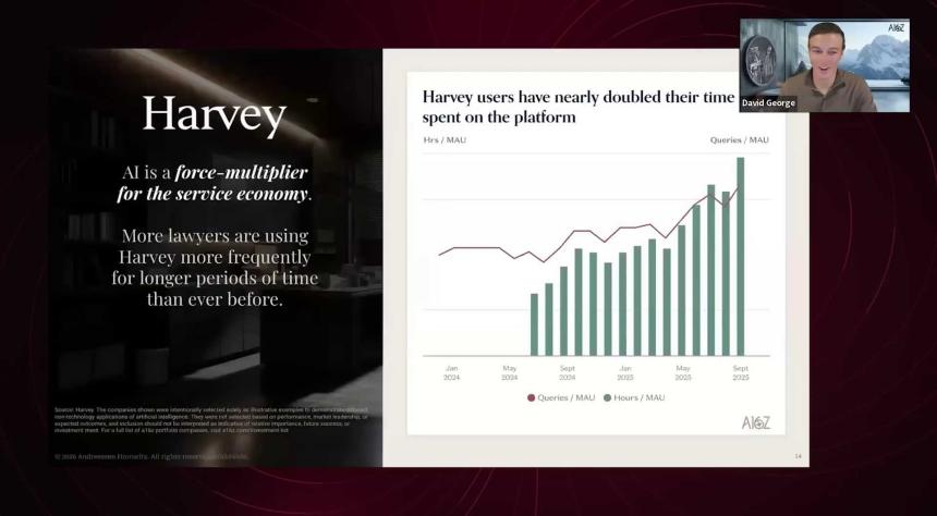 用户多久登录一次平台?登录后做了什么?你会看到,随着过去几年产品大幅优化,加上推理模型能力提升,法律工作和逻辑推理本身高度相关。用户在产品上花费的时间几乎是以前的两倍。事实证明,AI 非常擅长在法律领域的事务。律师数量并没有减少,但效率大幅提升。和 Harvey 相关最重要的一点是:用户在产品上花费大量时间,并且从中获得巨大价值,这非常关键。