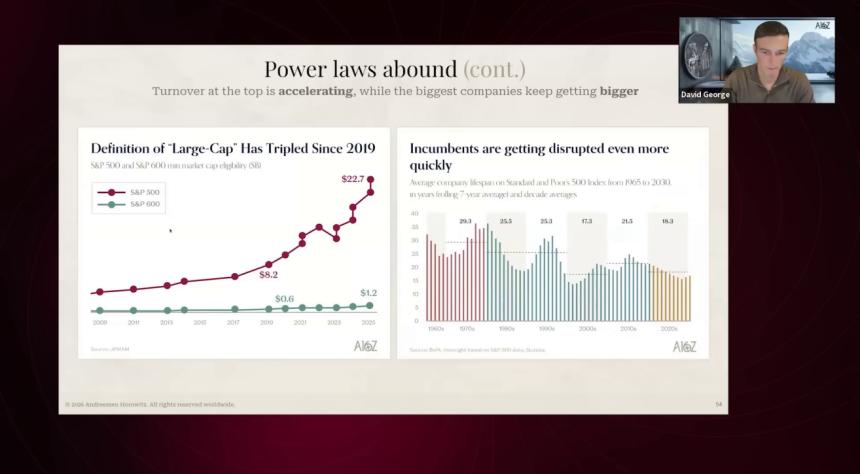 幂律在公开市场也同样存在。2019 年以来,大盘股的定义标准已经翻了三倍。右侧这张图表是我们最新的数据分析,非常有意思:标普 500 公司的平均“任期”,也就是一家公司进入标普 500 后,能留在里面的时间,过去 50 年下降了 40%。企业被颠覆的速度越来越快,这与技术驱动市场的变革速度完全吻合。