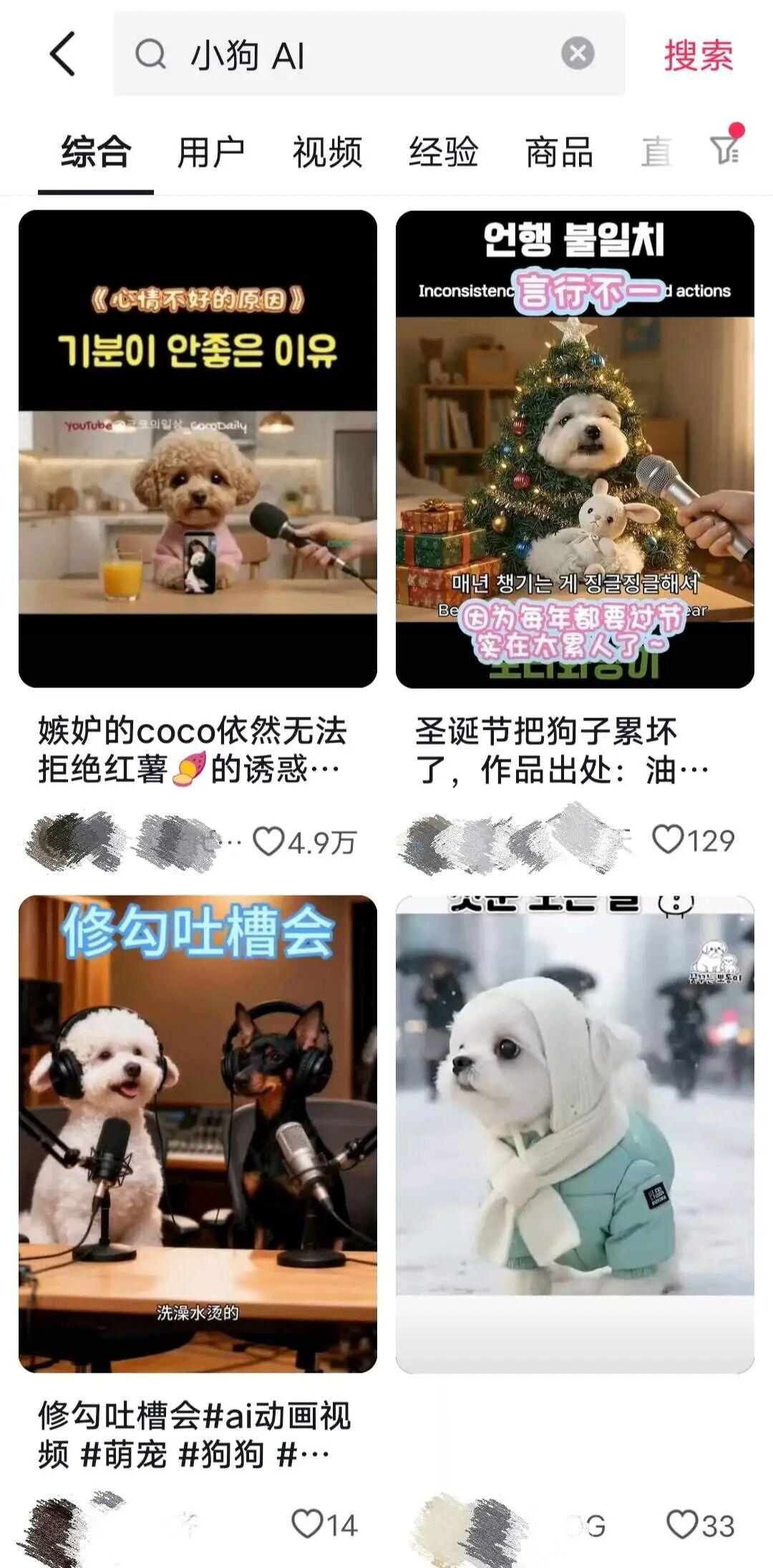 “最近真的很爱看韩国那个AI小狗的视频,根本停不下来,有人能懂吗?”12月,一位小红书用户发布了这样一条笔记,共收获超过2300个点赞、接近600条回复。沉迷AI小狗的人们,彼此分享着“连看好几遍”、“浪费三小时”的观看感受。无论是在下雨天接受采访哈哈大笑的马尔济斯犬“大麦”,还是面对镜头大喊“姨姨,爱你哟”的比熊犬“云朵”,“总有一款诈骗视频适合你”。