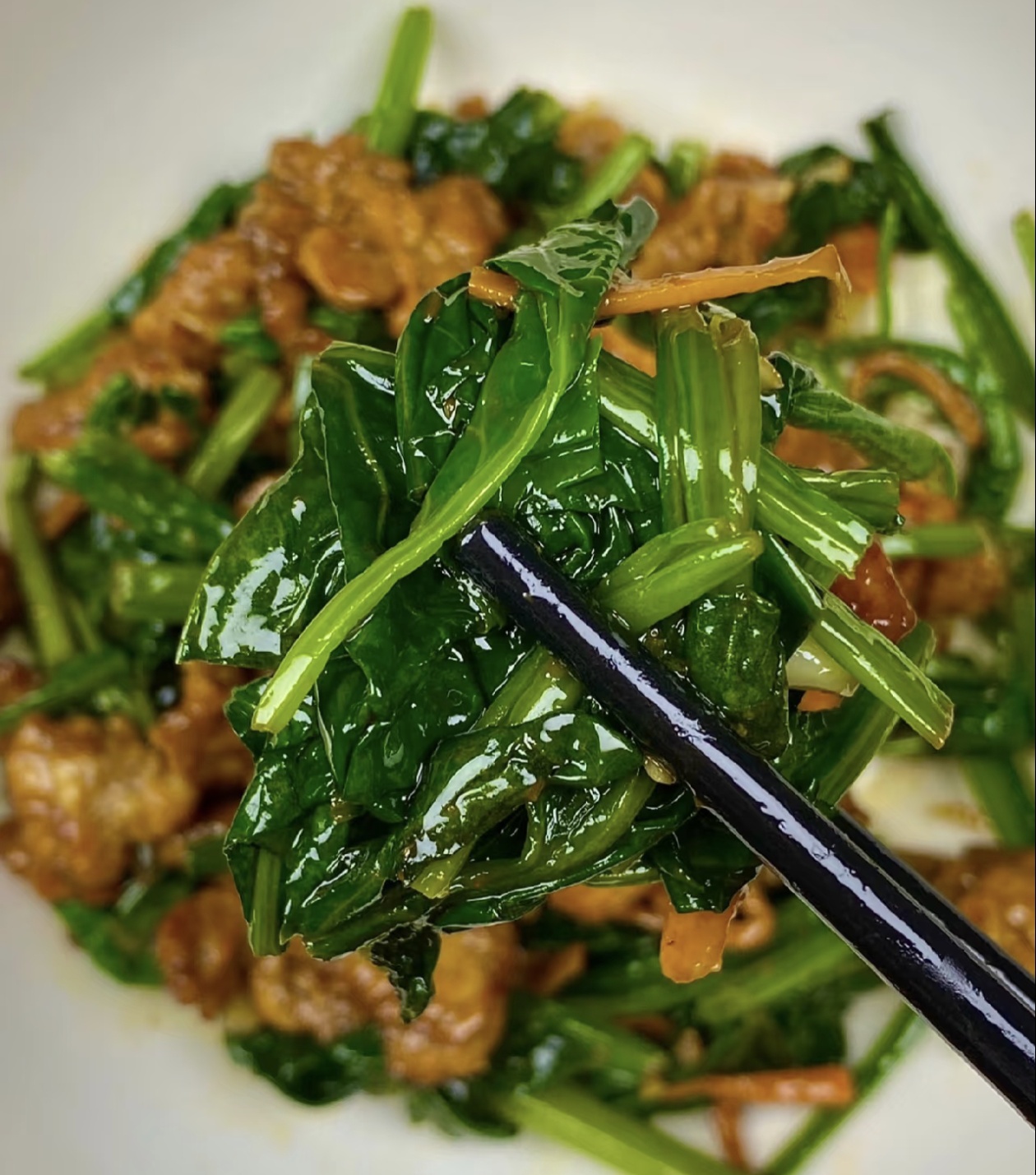 随后放入处理好的菠菜段,大火快速翻炒均匀,让菠菜充分吸收肉片的鲜香,翻炒十几秒后,加少许生抽调味,无需额外放盐,腌制肉片和生抽的咸味已经足够,口味重的可根据喜好微调,继续大火快炒三十秒,让所有食材的味道充分融合,菠菜吸满肉汁,肉片裹着菜香,全程大火快炒,避免长时间翻炒导致菠菜出水、肉片变老,翻炒均匀后即可关火出锅,整个炒制过程不过几分钟,快手又省事。