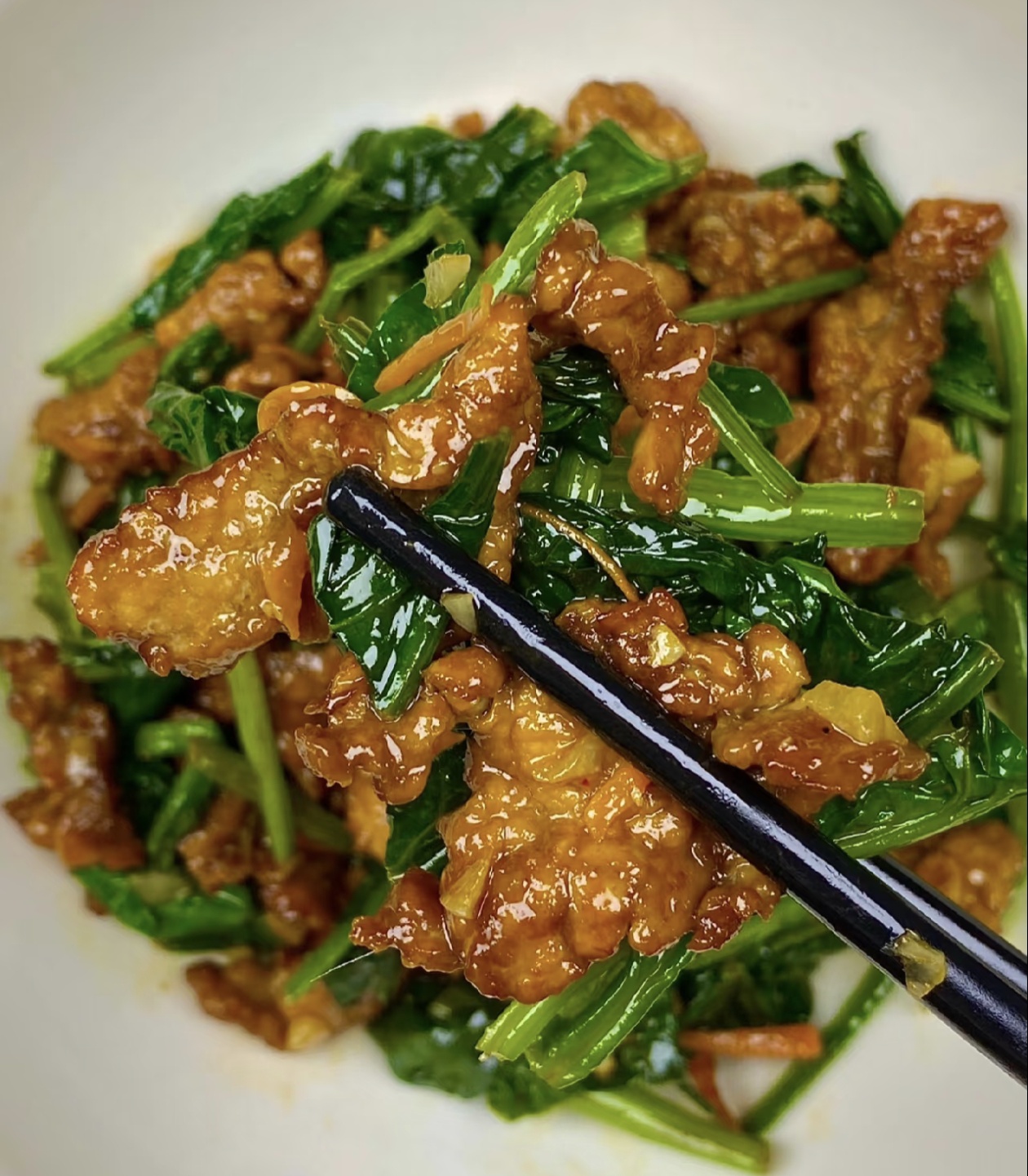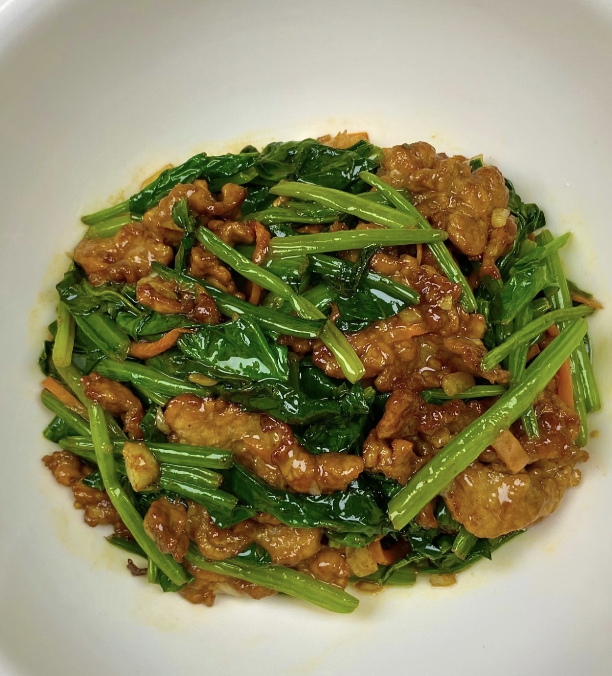 出锅的菠菜炒肉,色泽鲜亮诱人,翠绿的菠菜、粉嫩的肉片搭配橙红的胡萝卜丝,看着就让人食欲大开,夹一筷子入口,肉片滑嫩软糯,咬开后满是鲜美的肉汁,丝毫没有柴硬的口感,菠菜清脆爽口,带着淡淡的清甜,完全没有涩味,每一根菠菜都吸足了肉香,鲜而不腻,清而有味,简单的食材,经过朴素的烹饪,化作餐桌上最治愈的美味。