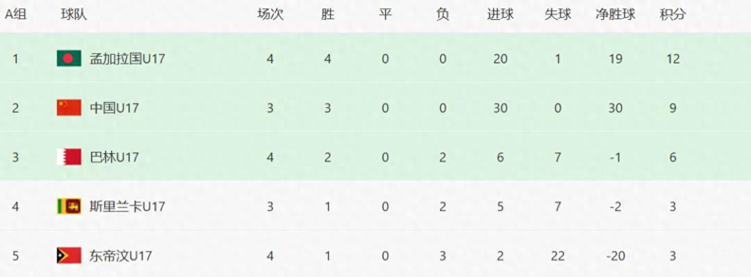 这么一来,A组的最新排名也就水落石出了。中国队三战全胜(4-0巴林、14-0东帝汶、12-0文莱)积9分,净胜球高达30个,暂时领跑积分榜;孟加拉队同样三战全胜(5-0东帝汶、8-0文莱、5-0斯里兰卡)积9分,净胜球18个紧随其后;巴林队1胜1负积3分、东帝汶1胜2负积3分、斯里兰卡1胜2负积3分,而文莱则四战全败垫底。
