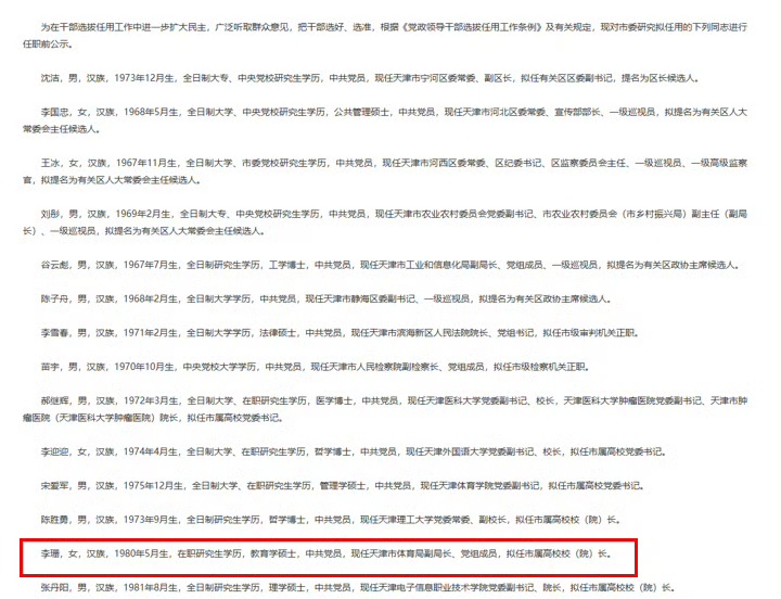 12月25日,天津曝光了一条最新的任命,李珊的副局长现在是副厅级干部,但是她将会被任命为市属高校的院长,也就是正厅级干部,一般情况下球队成绩不好的时候,对于李珊是有影响的,没想到她意外的很快获得了提拔,这也算是一个特例。李珊是2004年的奥运会冠军,是和冯坤以及周苏红一批的球员,正是因为奥运冠军的身份,所以李珊的事业运真的非常好,能够当一个高校的一把手还是非常的难的,同时期的周苏红现在职位也很高。