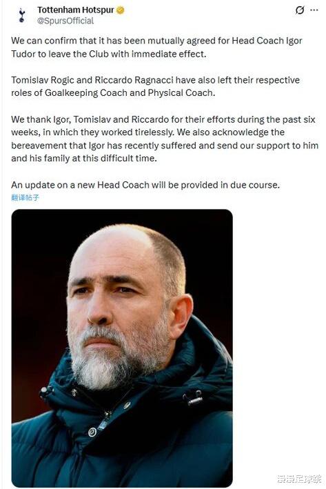 英超赛季进入最残酷的冲刺阶段,北伦敦却突然爆出重磅消息,托特纳姆热刺正式宣布与主帅伊戈尔·图多尔提前解约,随着他下课,助理教练罗吉奇和体能教练拉尼亚奇也一同离队。这位克罗地亚教头的执教周期定格在短短44天,5场英超夺1分,欧冠出局;成为近年来英超最“短命”的主教练之一。