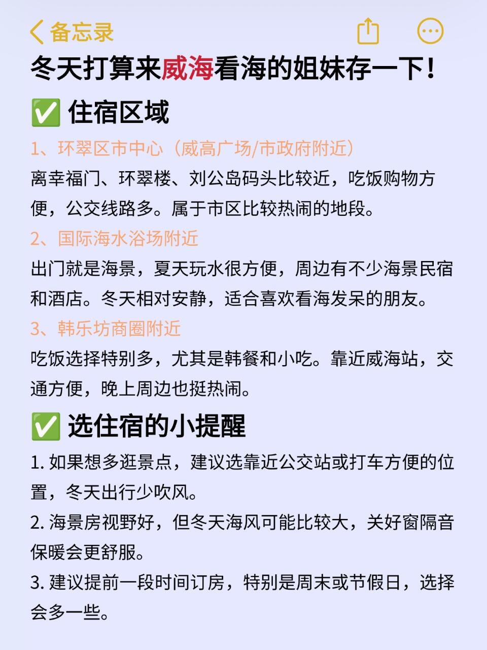 这几天下来感觉威海适合慢慢逛,不用赶行程。海边风大记得戴帽子,鞋子要穿舒服的。吃饭可以试试本地海鲜和韩餐,价格都挺实在。公交能到不少地方,天冷的时候结合打车更轻松。