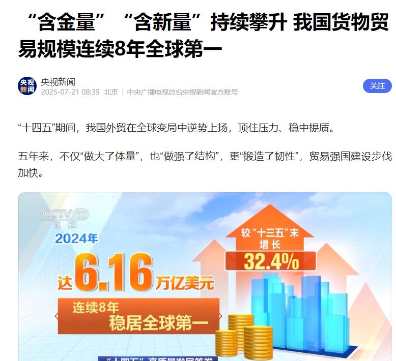 信息来源:“含金量”“含新量”持续攀升 我国货物贸易规模连续8年全球第一