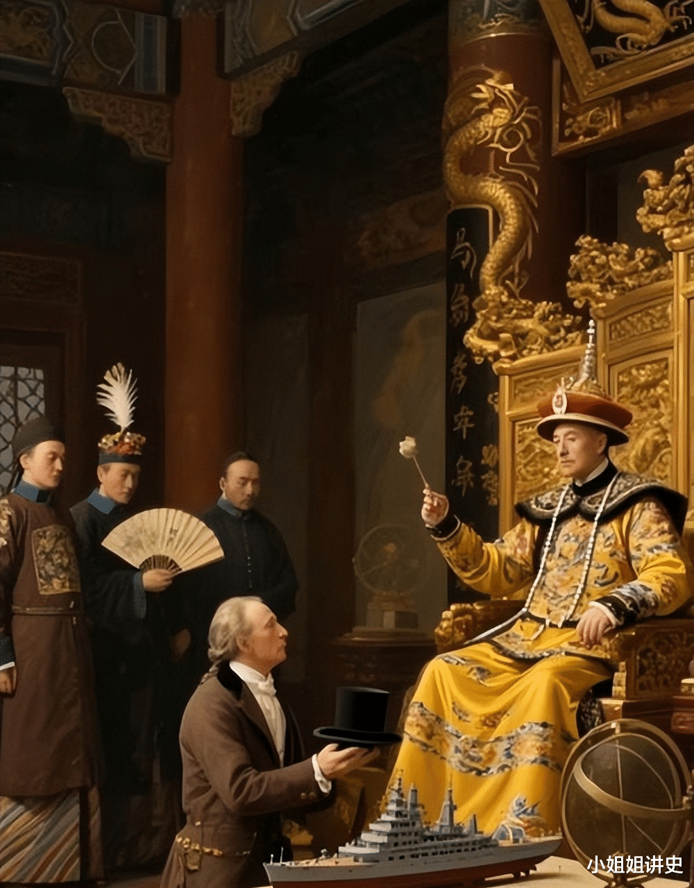 在礼部尚书的指导下,马嘎尔尼走进殿内,他被眼前的景象所震撼:乾隆皇帝端坐在龙椅上,身着明黄色龙袍,头戴缀有东珠的朝冠,周身散发着不怒自威的气势。两侧侍立着王公大臣,所有人都保持着绝对的肃静。