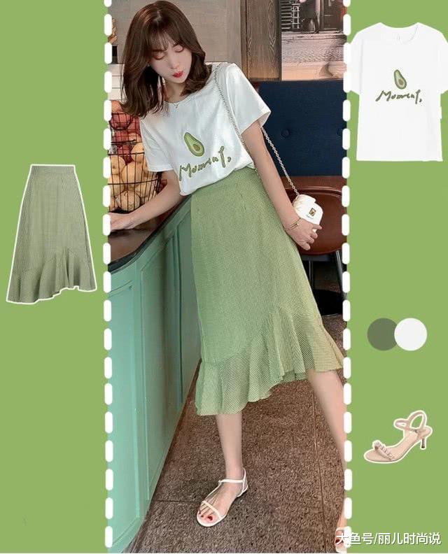 好小清新的一套有木有?牛油果绿色的中长半身裙,裙摆皱褶荷叶边设计,更添时尚气息,上衣选择一件白色短袖t,夏天的气息满满,这么充满少女感十足的学生党穿搭,喜欢这样穿的girl不妨借鉴一下咯!