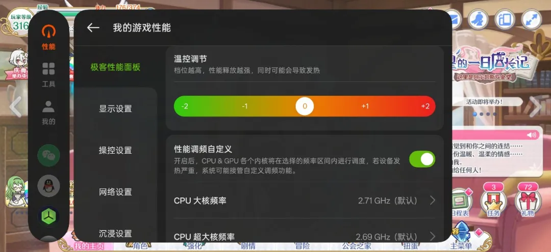 拥有良好的硬件基础,却还是会发生游戏体验不尽如人意的情况,这种情形屡见不鲜。除开硬件特殊体质等因素,对此负有较大责任的其实是厂商的温控策略。在温控策略下,牺牲的往往是用户的游戏体验。这种做法饱受用户诟病,手机在用户手中,对于手机底层的控制权却依旧掌握在厂商手中,反而让人力不从心、难以接受。然而,真我坚信性能释放不该成为厂商的一言堂,有必要将性能的选择权交还给用户。于是,真我Neo8带来全新的极客性能面板。极客性能面板在原来调节CPU、GPU频率的基础上,加入了温控调节功能。温控调节共有五档,用户可以在无Root的状态下自由选择温控阈值,配合频率调节,性能释放变得可控、可视、可自定义,供玩家榨干每一滴性能,成为真我Neo8实现越级的一大手段。