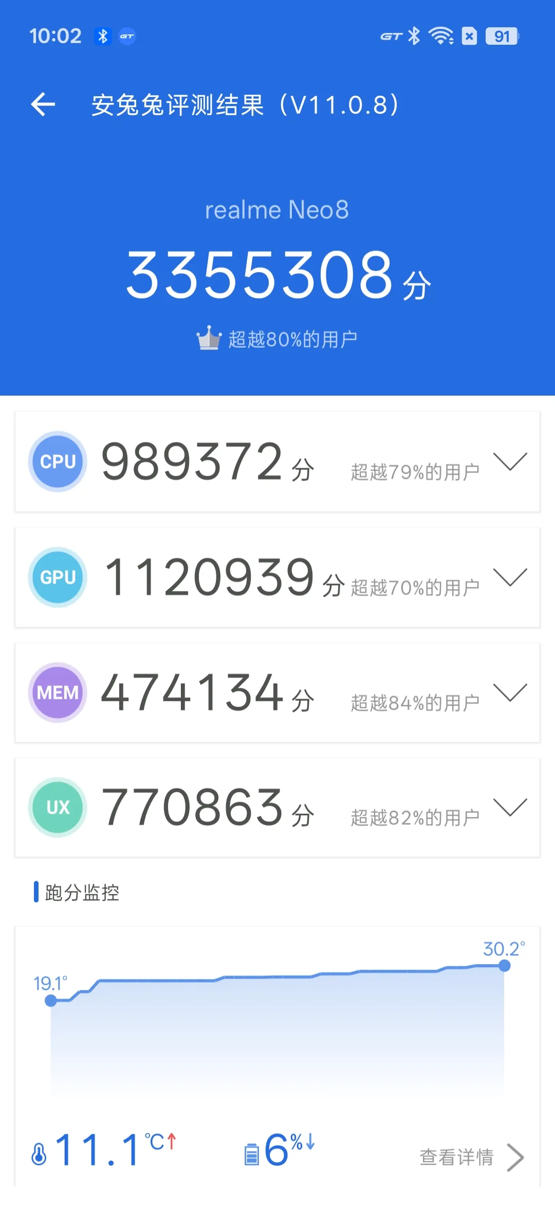 我们手上这台16GB RAM+1TB ROM规格的真我Neo8,在一项项测试中发挥出惊人的实力:安兔兔V11跑分中,夺得335万分的成绩,这与许多骁龙8至尊版机型平起平坐;而Geekbanch 6测试中真我Neo8斩获单核2818、多核9436的高分;3D Mark自不必多说,多场景轻易掌控。需要注意的是,这些分数建立于常规模式之上,倘若开启GT模式,处理器性能得以获得更进一步的释放,测试成绩将会更上一层楼。