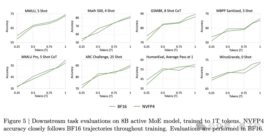 在MMLU、GSM8K、HumanEval等下游任务上,NVFP4训练的模型与BF16版本的准确率曲线几乎完全重合。