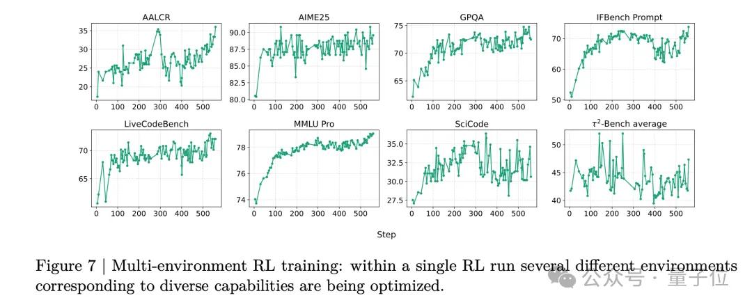 AIME25数学分数从80提升到90,LiveCodeBench从65提升到72,τ²-Bench工具使用从40提升到50左右,全程呈稳定上升趋势。