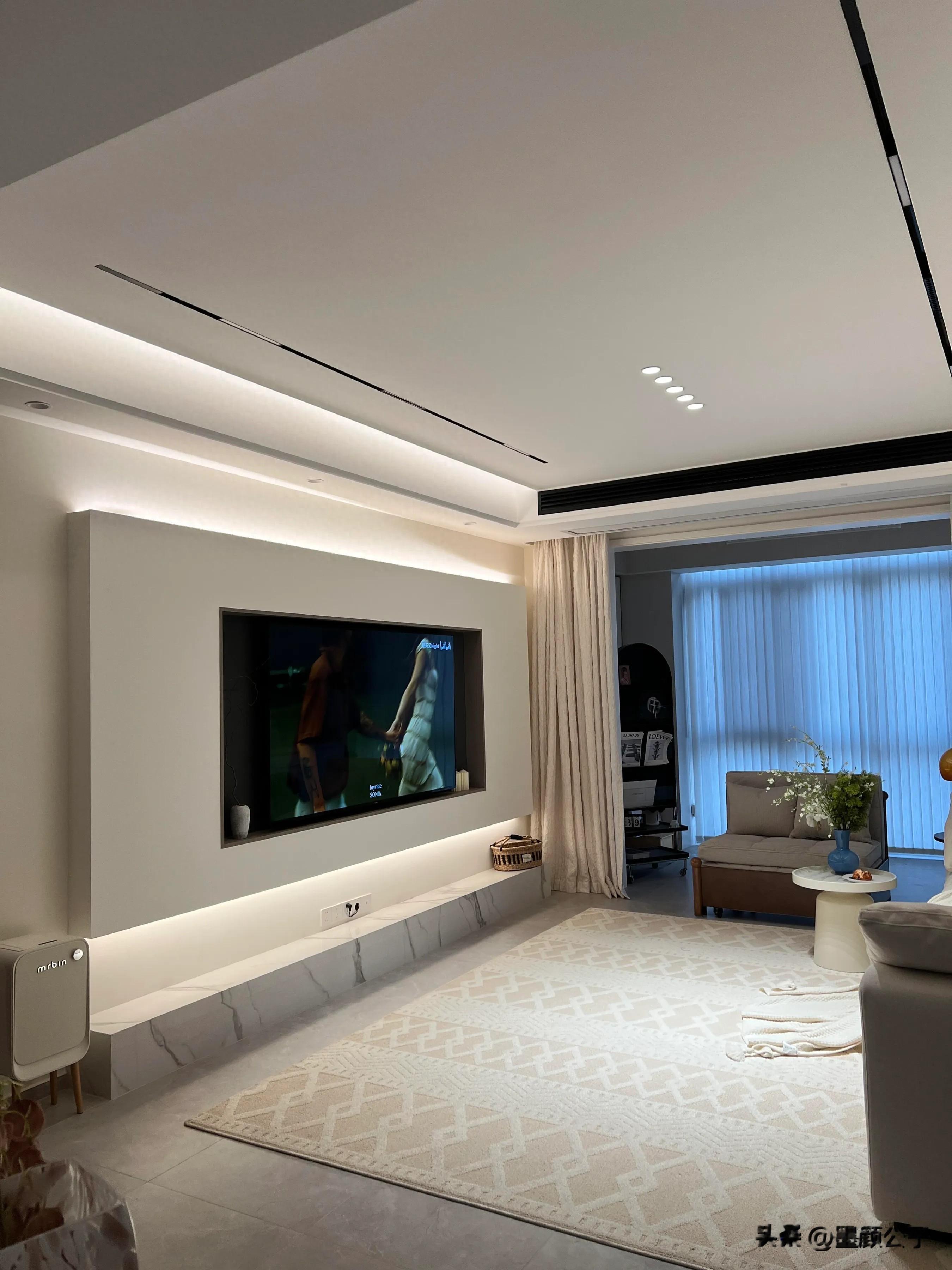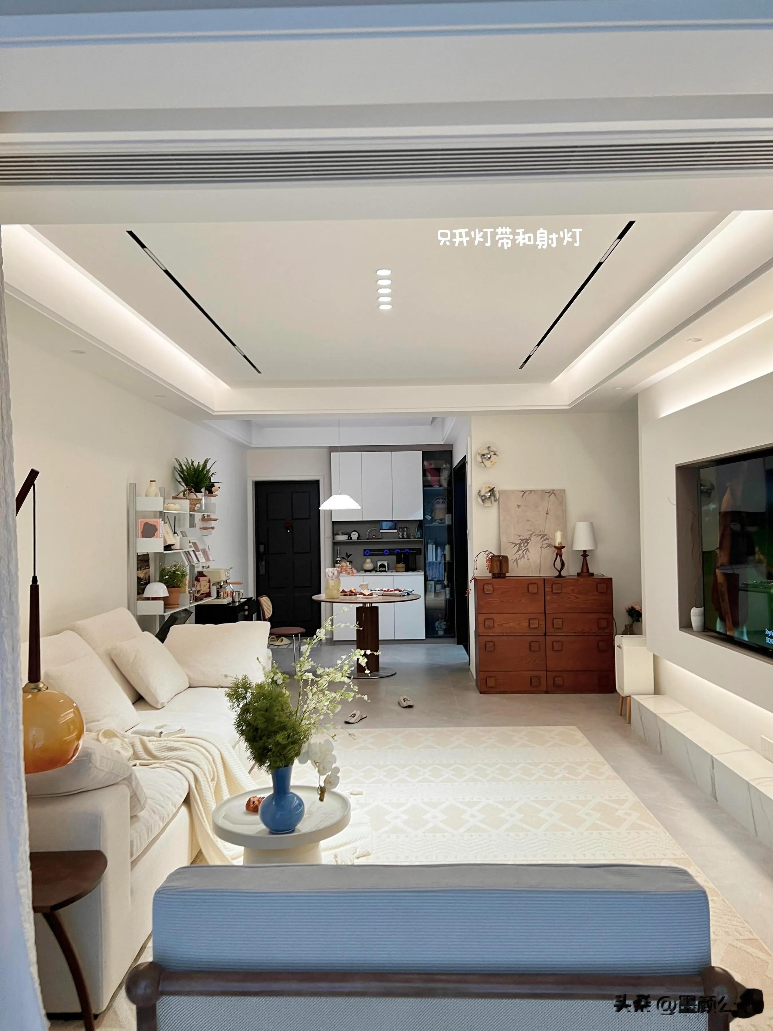 28岁拥有人生第一套房 ,没有过度装修,全屋以白色为主色 黑、棕两色为辅的搭配,客厅无主灯,整体设计提升了层次感和氛围感,一打开灯,那种光影效果简直绝了,这种高级感,恐怕没有年轻人会拒绝吧