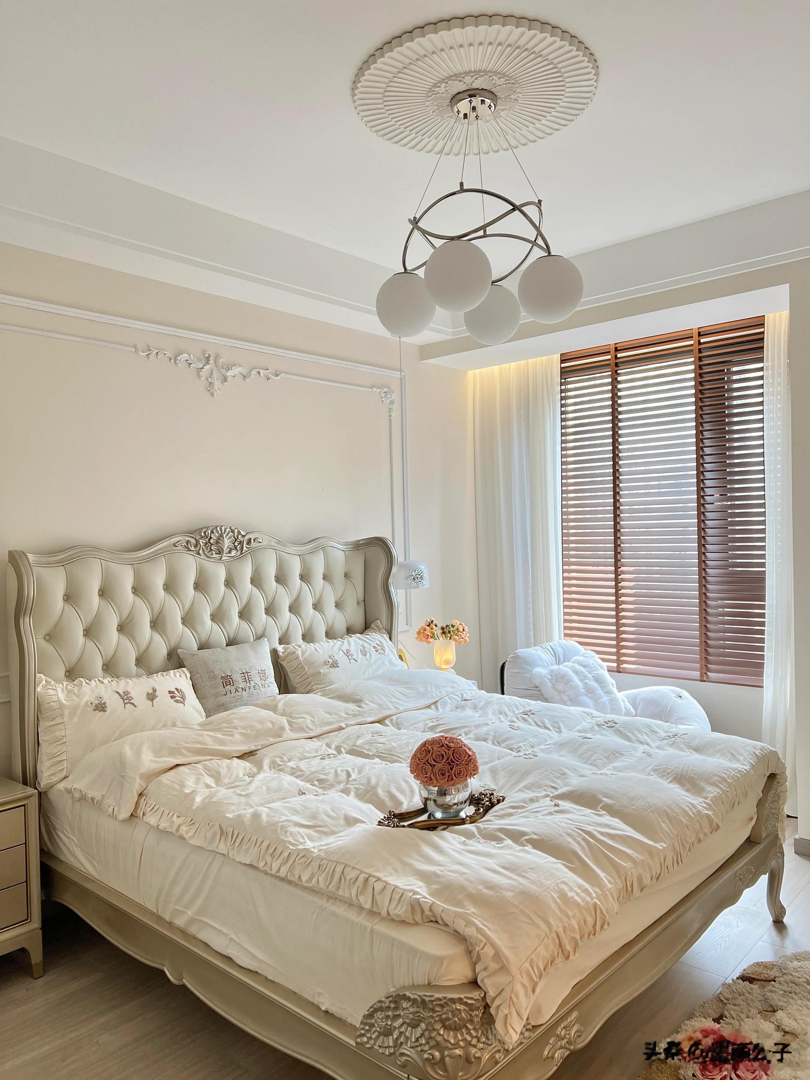 床头线条柔美流畅,拉扣设计错落有致,高级皮质富有光泽感,地板选了浅色木地板,柔和又不压层高,法式PU灯盘,背景墙面也做了法式线条,墙面是通刷的奶油色乳胶漆,很温馨百搭又耐看,空间视觉上显大很多!