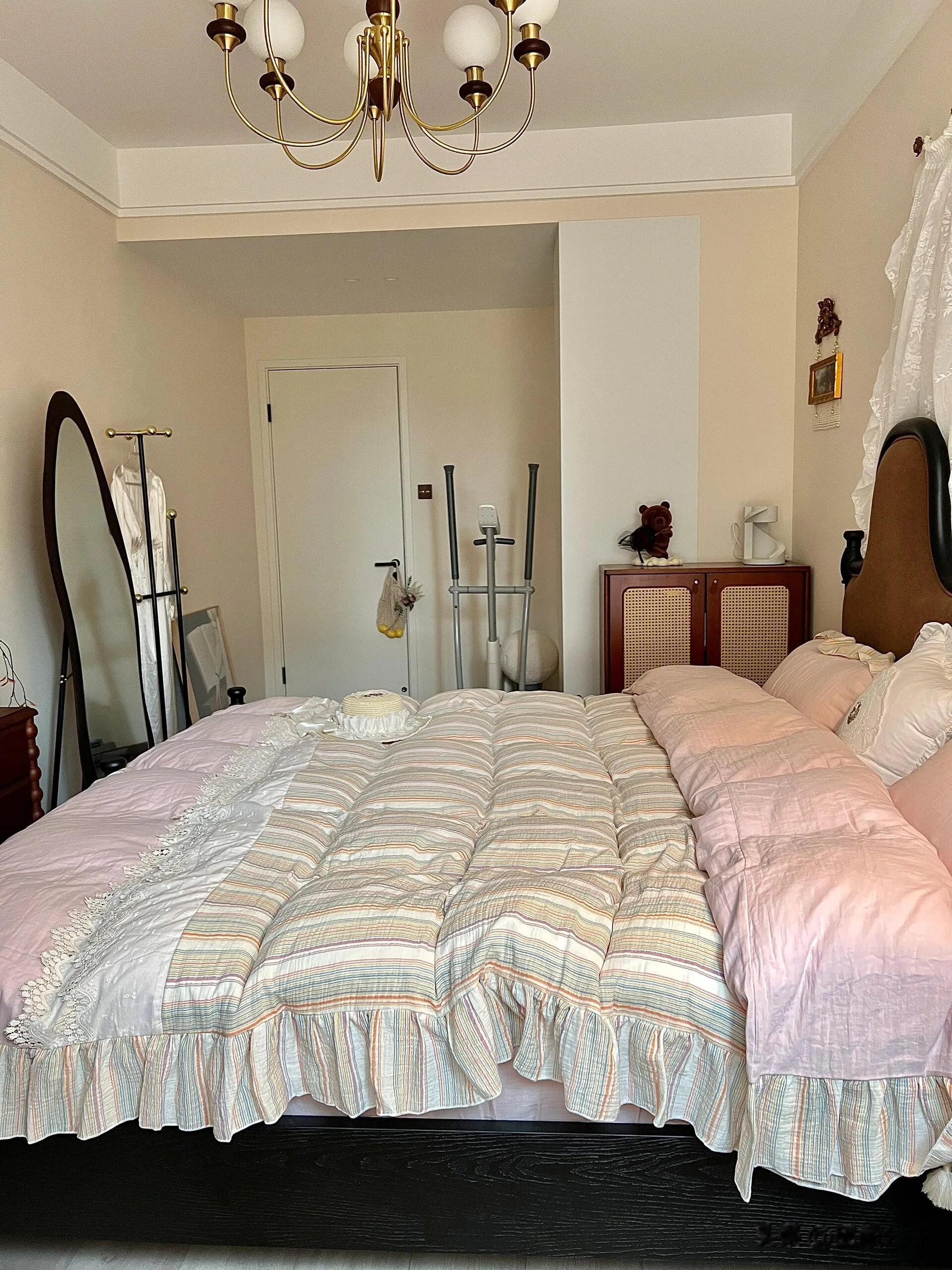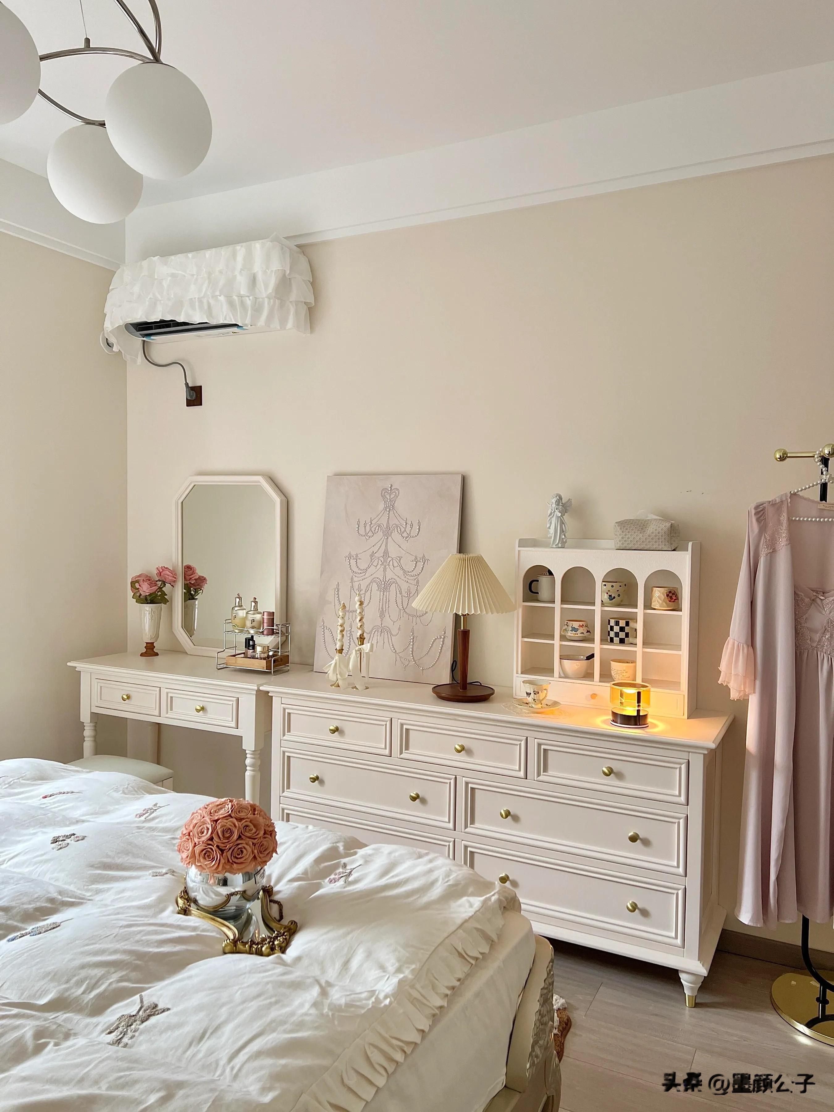 次卧室面积15平,把它装成法式复古风,因为卧室不大,但是喜欢大床,放上1.8的床,床尾距离很窄,但是床尾不多不少正好剩 30cm的过道