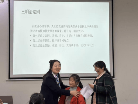 活动现场,主持人以专业视角统筹节奏,三十三中心理老师李雪梅以“同心圆”理论为切入点,从家庭、学校、社区三个维度剖析儿童成长环境,围绕亲子沟通核心展开深度分享。李老师先系统阐释沟通的本质的内涵,随后结合生活案例拆解调味品效应(用轻松表达化解严肃话题)、可是效应(先认同再提建议)、三明治法则(肯定+建议+鼓励)等实用心理学技巧,同时通过对比列举“你怎么这么不听话”等“避坑”词语与“妈妈相信你能做好”等推荐用语,让家长快速掌握沟通要领。分享过程中,互动氛围尤为热烈,李老师每抛出一个问题,孩子们便纷纷举手、踊跃回应,有的分享自己与家长沟通中的小困惑,有的主动讲述曾经成功沟通的小故事,家长们也忍不住参与讨论,现场问答交织、掌声不断。