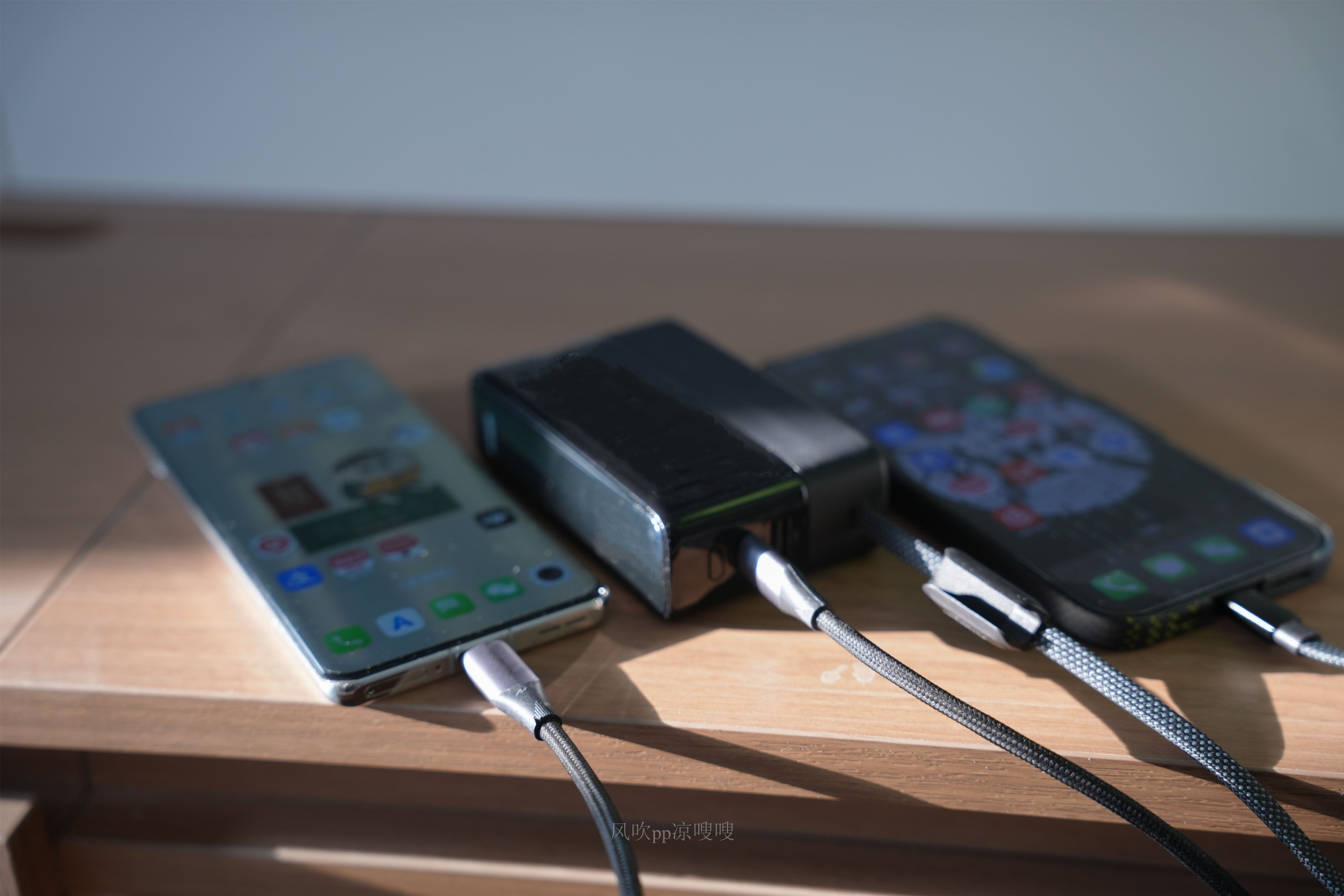 双接口加上自带线理论上支持同时对多台设备快充,这对双持党来说十分的友好。实测Type-C口+Type-C快充线同时给两台设备充电,最大能提供100W+30W的功率,这也就意味着它可以轻松应对笔记本+手机的组合,如果给两台手机同时快充自然也是绰绰有余的。万一需要同时使用三口充电的场景,P20 Pro同样能够轻松搞定,但需要注意的是三口输出最大功率是100W+15W+15W,使用时注意合理分配接口就行。