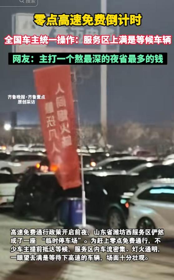 还有人发视频调侃,上千台车堵在小小的服务区,等待0点开放的免费通行。