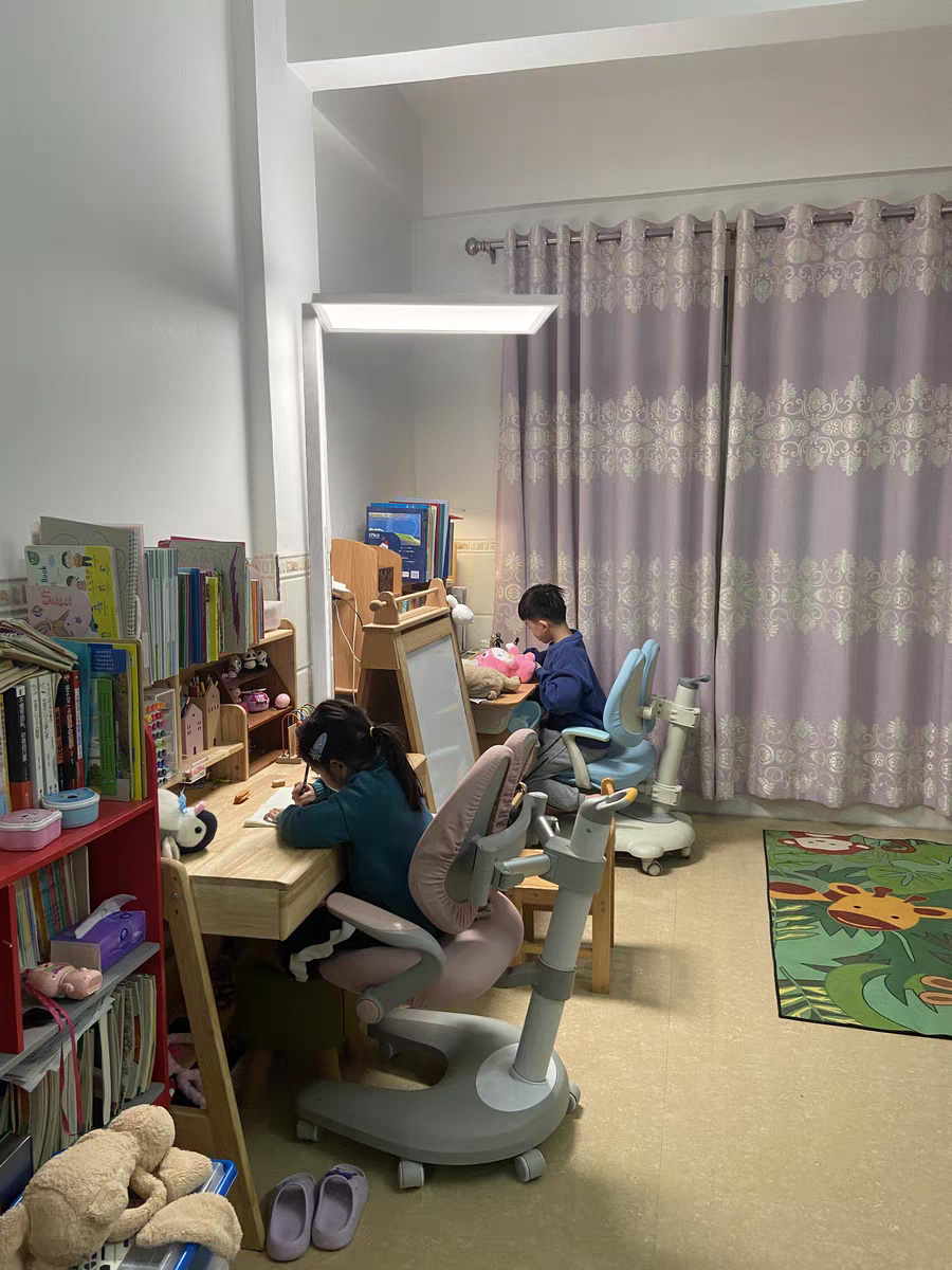 为什么重要? 孩子眼睛不用在明暗之间频繁适应,长时间写作业不容易累。大路灯上下双光源设计,通过天花板漫反射,能让整个学习区域光线柔和,手影也淡很多。