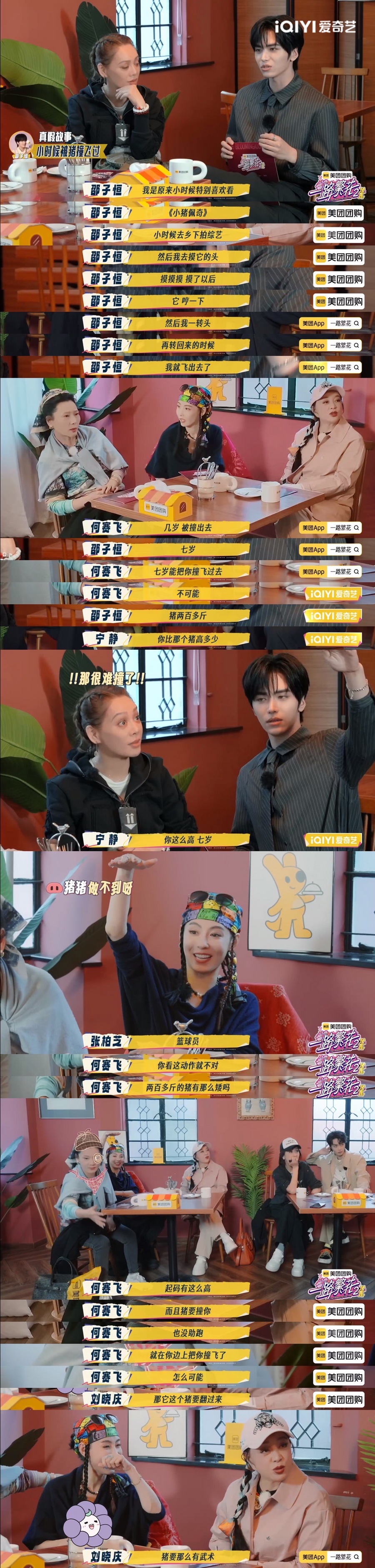 刘晓庆则说起上学途中雨中坠崖、攀石自救的往事;柯淳说自己曾摔下楼梯“坐”空调外机上,结果被姐姐集体审讯:“是坐还是挂?说清楚!”。邵子恒编了个“7岁被200斤猪撞飞”的剧本,结果在身高、物理原理和猪的战斗值问题上彻底翻车!最终被姐姐们识破卧底身份,全票打飞。