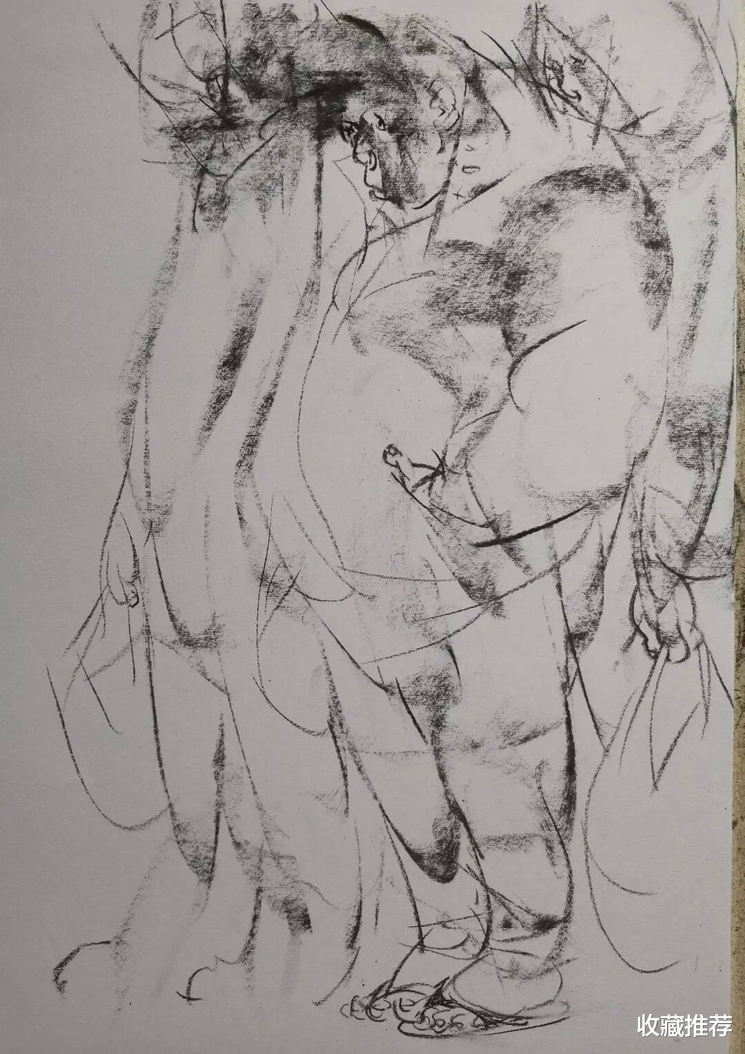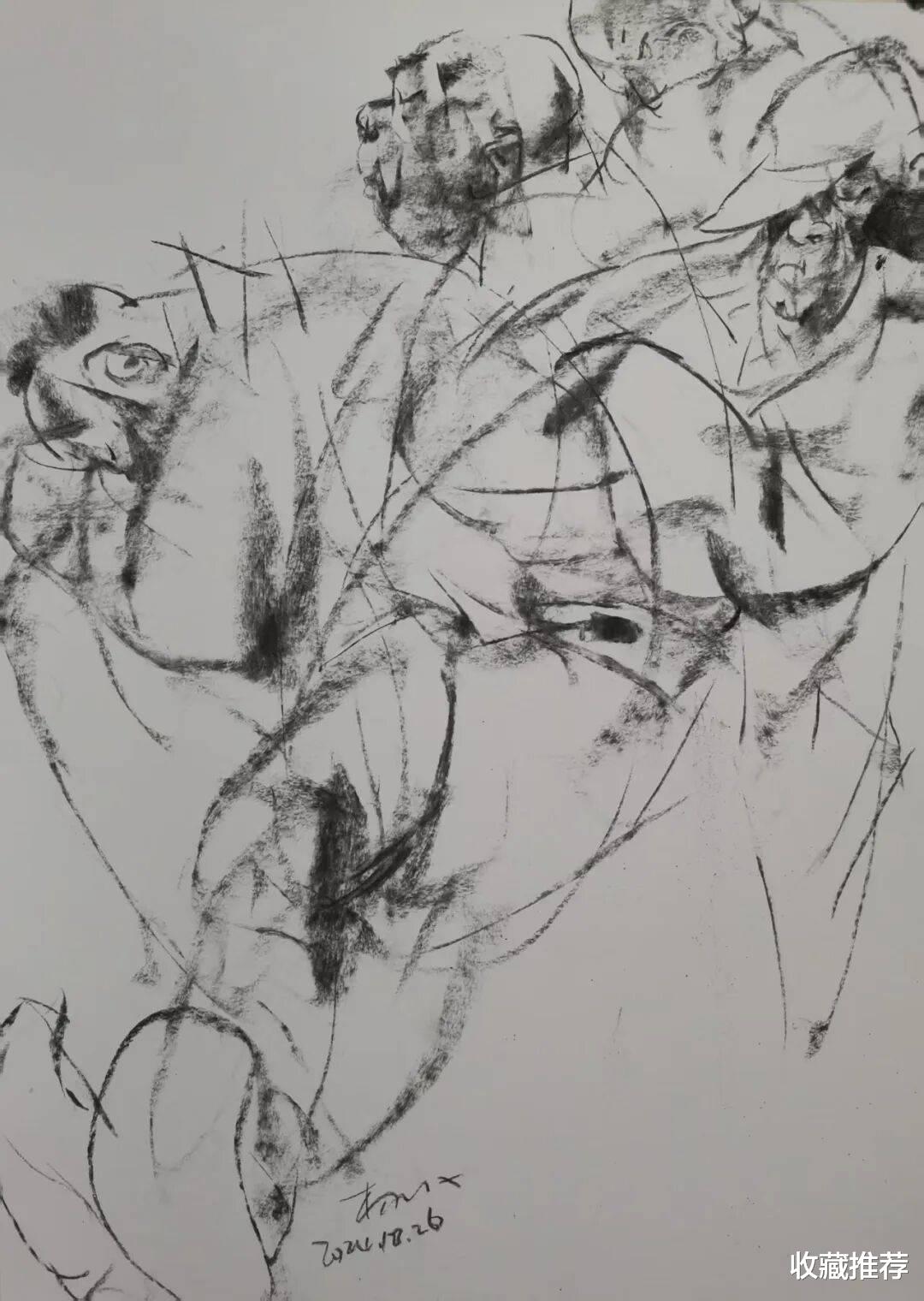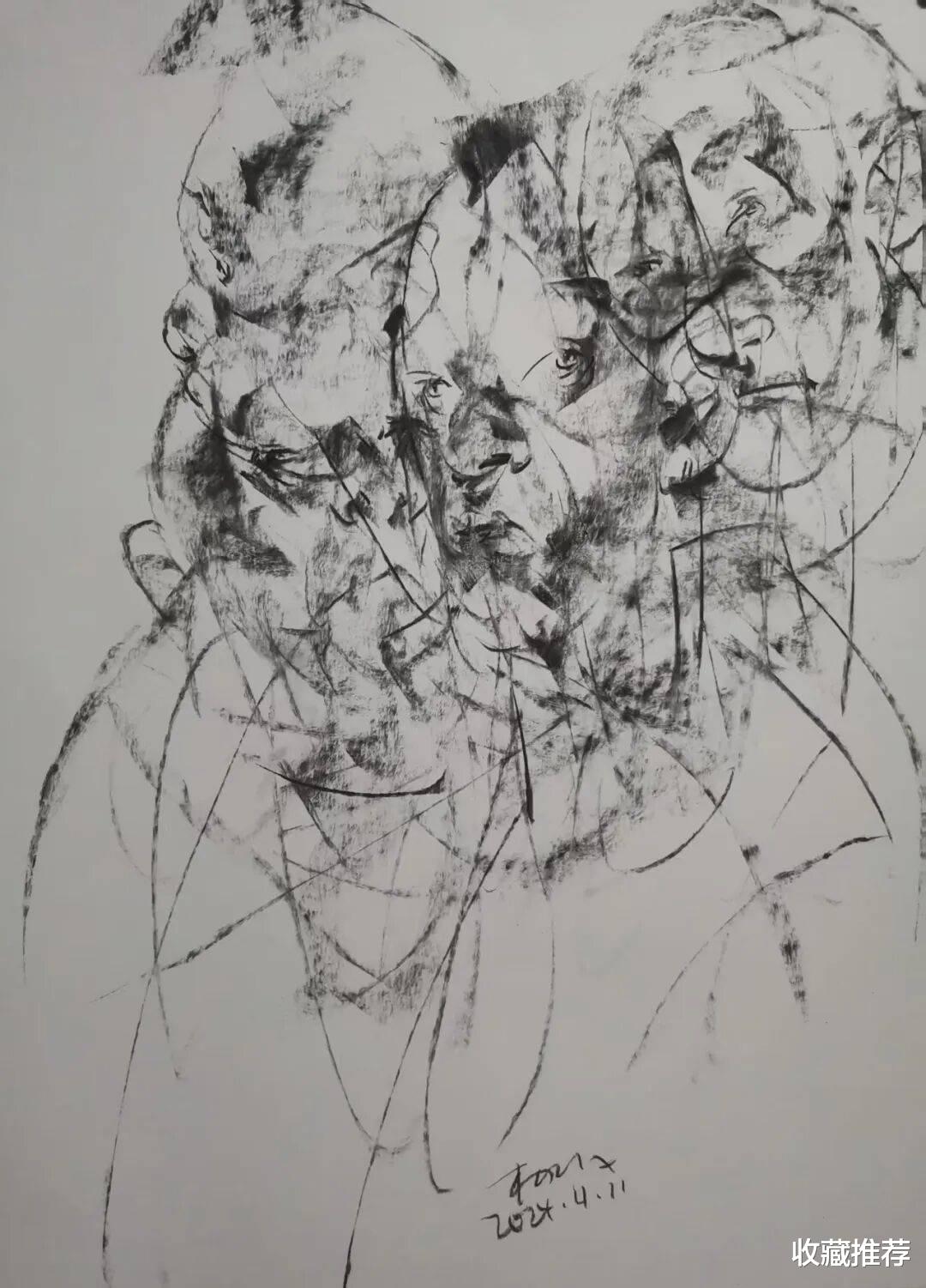 作为雕塑家,杨学军的速写并非孤立存在,而是与他雕塑创作紧密相连。速写不仅是他记录生活、提炼素材的方式,更是他雕塑创作灵感的重要来源。在速写和默写的过程中,他能够迅速瞬间捕捉对象的形态特征、情绪与内在精神,使其表现达到了形神兼备、直击心灵的艺术感染力。有人评价他的速写风格:大开大合、不拘一格、乱而有序、眼神凝视、直击灵魂,颇有美国画家尼古拉•费欣大师的痕迹。他的绘画用笔速度很快,仿佛风弛一般!他画面形态里的立体感很强,同时呈现出的重影、叠加、乱线和似与不似的幻像形态,融汇了西方立体主义和东方哲学思想,体现了艺术家特立独行的现代审美追求。这种能力在他的雕塑创作中也展示无遗。因此,他的雕塑作品极具个人鲜明的艺术语言风格,“共情”感极强,彰显出一种独特的艺术魅力。