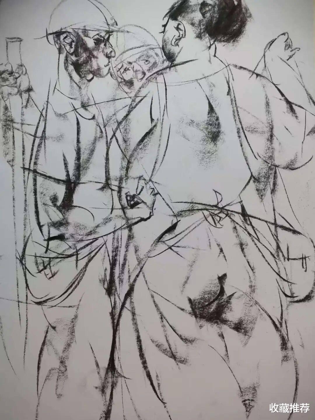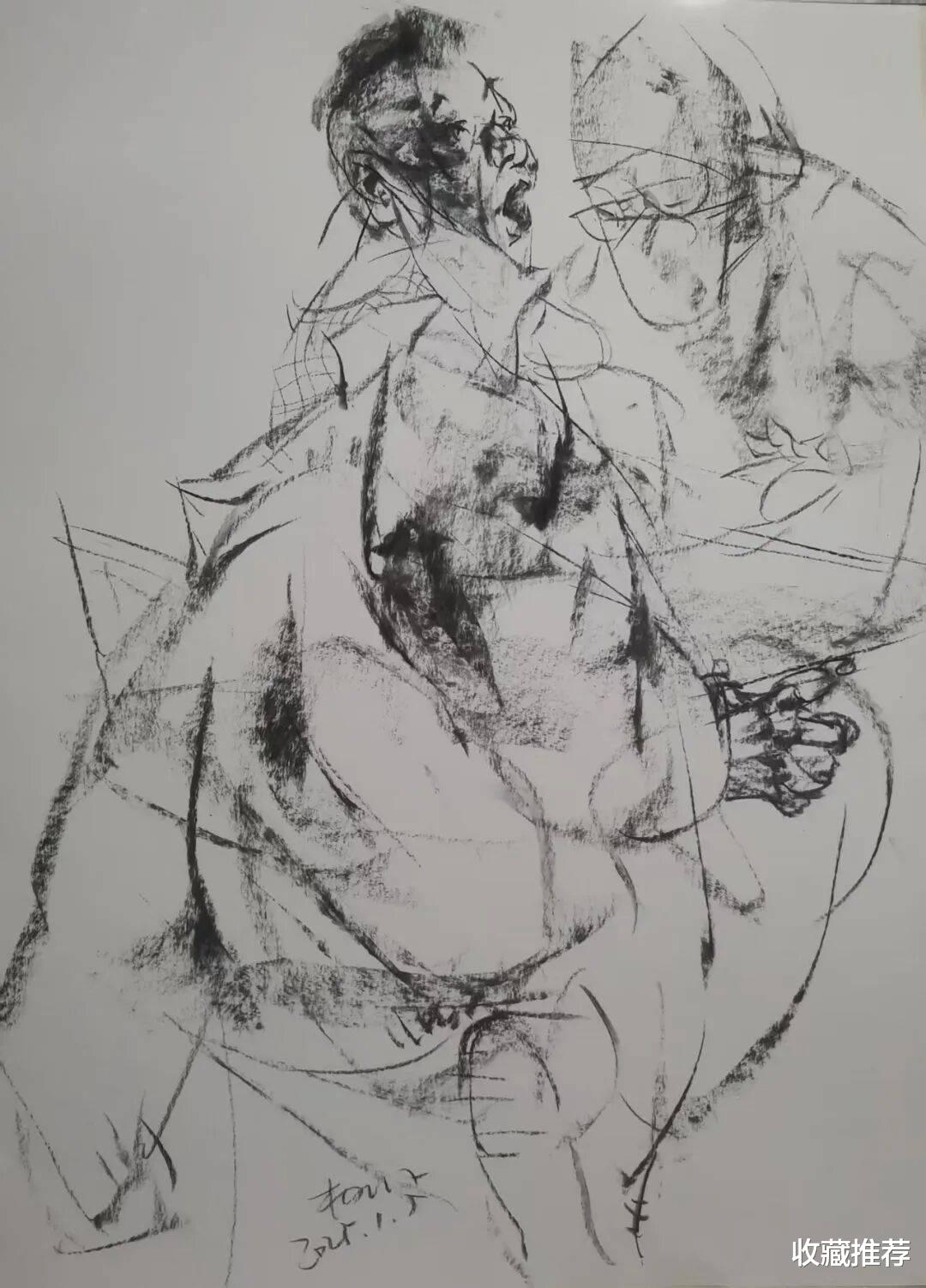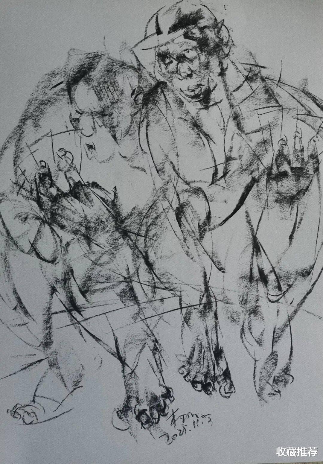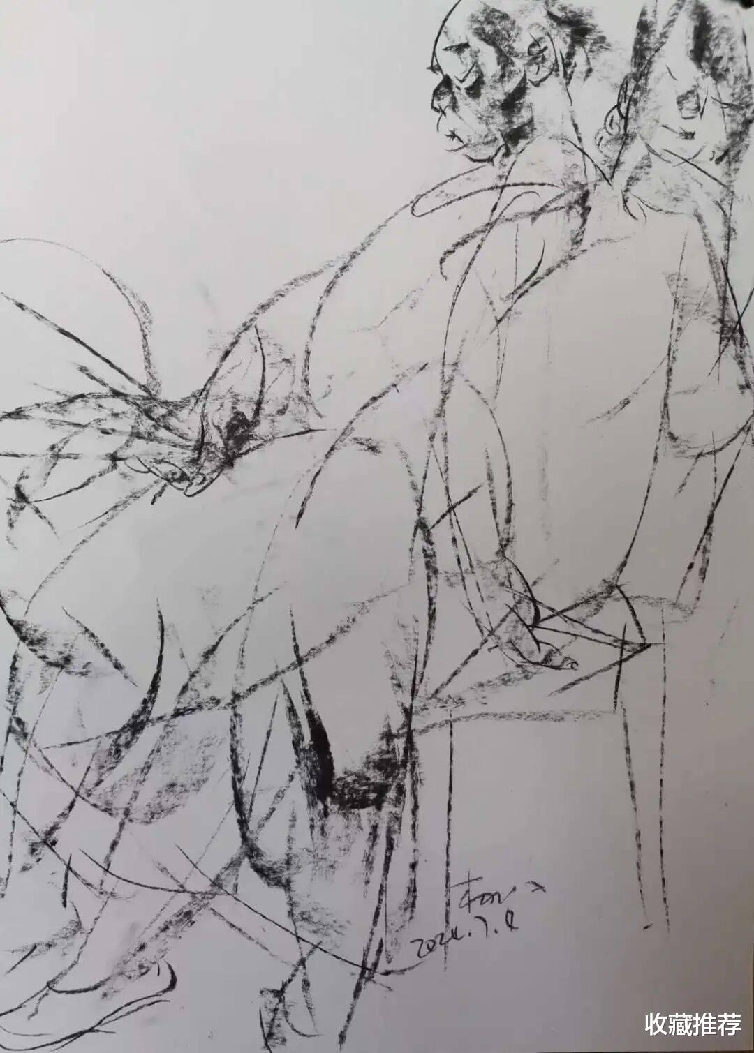 作为雕塑家,杨学军的速写并非孤立存在,而是与他雕塑创作紧密相连。速写不仅是他记录生活、提炼素材的方式,更是他雕塑创作灵感的重要来源。在速写和默写的过程中,他能够迅速瞬间捕捉对象的形态特征、情绪与内在精神,使其表现达到了形神兼备、直击心灵的艺术感染力。有人评价他的速写风格:大开大合、不拘一格、乱而有序、眼神凝视、直击灵魂,颇有美国画家尼古拉•费欣大师的痕迹。他的绘画用笔速度很快,仿佛风弛一般!他画面形态里的立体感很强,同时呈现出的重影、叠加、乱线和似与不似的幻像形态,融汇了西方立体主义和东方哲学思想,体现了艺术家特立独行的现代审美追求。这种能力在他的雕塑创作中也展示无遗。因此,他的雕塑作品极具个人鲜明的艺术语言风格,“共情”感极强,彰显出一种独特的艺术魅力。