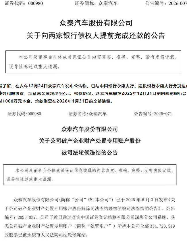 2026年1月26日,众泰汽车(证券代码:000980)发布公告(公告编号:2026-007)称,已提前履行债务和解协议,向中国银行永康支行偿还剩余债务212,014,262.93元(约2.12亿元),向建设银行永康支行偿还172,833,512.50元(约1.73亿元),两家银行的债务偿还责任已分别履行完毕。这一进展距2025年12月24日达成超4亿元债务和解仅过一月,当时协议约定2025年12月31日前各付1000万元本金,余款于2026年1月31日前清偿,众泰提前5天全额履约,展现出较强的偿债执行力。