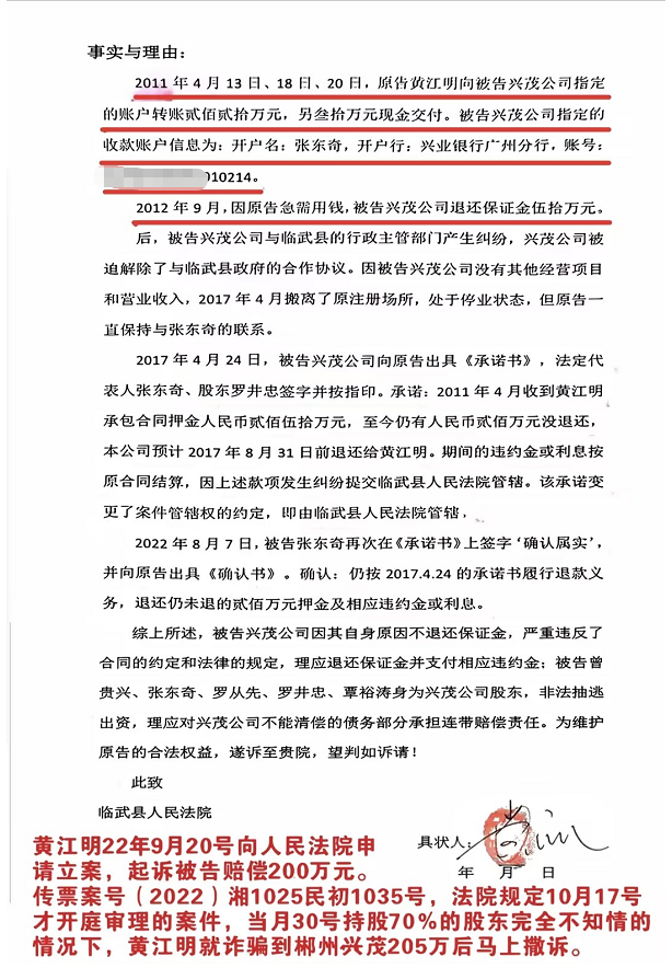 该案于2022年9月20日立案,原定于10月17日开庭。然而在黄江明及其股东的串通勾结下,在持股70%的股东毫不知情也未正式开庭的情况下,立案不到十天黄江明就骗取郴州兴茂公司205万元,后马上撤诉。整个过程迅速且隐蔽,程序合法性存在重大争议。三、控告路漫漫:公安机关“不立案”,嫌疑人已离境自2022年12月起,受害股东多次向临武县公安局控告黄江明涉嫌虚假诉讼罪、诈骗罪。尽管郴州市公安局曾在复核后以“事实不清、证据不足”撤销原不予立案决定,但临武县公安局在原告完全无法举证的情况下,再度作出不予立案的决定。三年来,受害人向相关部门举报一百多次,并在中央巡视组和郴州市人大的监督下仍未有转机,导致司法程序长期严重空转、黄江明诈骗205万三年都没有被立案侦查、据悉黄江明目前已潜逃境外。