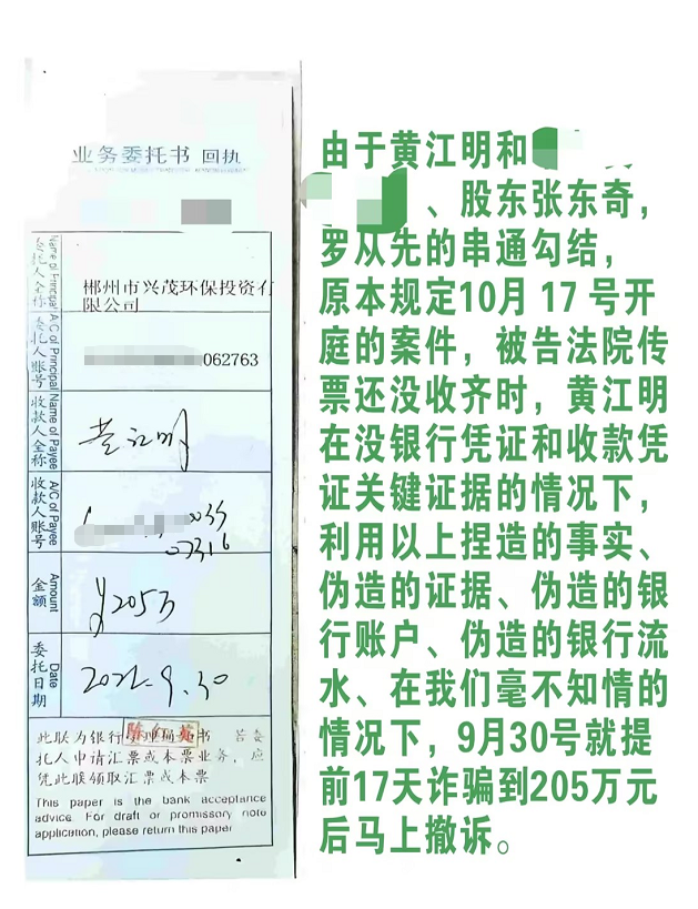 近日,湖南郴州临武律师黄江明,在没银行凭证和收款凭证关键基础证据的情况下,利用全部捏造的事实、伪造的证据、通过诉讼骗取郴州市兴茂环保投资有限公司205万元的案件,持续引发公众关注与愤慨。而受害企业股东三年来奔走控告,却屡遭公安机关以“无犯罪事实”为由不予立案。本案不仅是一起典型的律师重大诈骗,更是对司法诚信与监督机制的一次严峻拷问。一、伪造“一条龙”:银行账户、银行帐号、银行流水、250万收款承诺书及还款确认书均系伪造据受害企业股东提供的证据,律师黄江明在2022年9月,诉讼中所依据的全部事实和相应证据全系伪造:1. 凭空捏造收款账户:黄江明在诉讼中声称曾向郴州兴茂指定的收款帐户:兴业银行广州分行转账220万元。后经银行核查,该账户和帐号从未存在,纯属虚构。2. 移花接木伪造银行流水:其向法院提交的220万元转账凭证,实际源自其他银行账户的流水记录,通过篡改开户行信息冒充成涉案账户交易流水,蓄意误导法庭。3. 炮制文书冒充承诺:伪造250万收款承诺书和还款确认书:在无法提供250万收款凭证的情况下,黄江明和股东内鬼在2022年8月7日同一天串通勾结伪造《承诺书》和两份《确认书》,并把承诺书的形成时间倒签为2017年,且均未加盖公司公章也未时任法人签名,却被采信为收款还款核心证据。二、诉讼变“速骗”:立案十日即划款,股东竟毫不知情