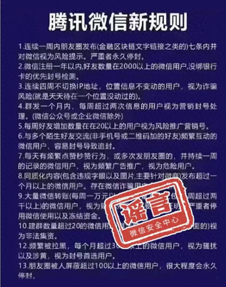 近日,网络上流传着“腾讯微信新规则”相关消息,其中“好友太多会被封”“地址不变会被封”等说法。严重者永久停封”“朋友圈被人屏蔽超过 100 以上的微信用户,很大程度会永久停封”等消息更是无稽之谈。