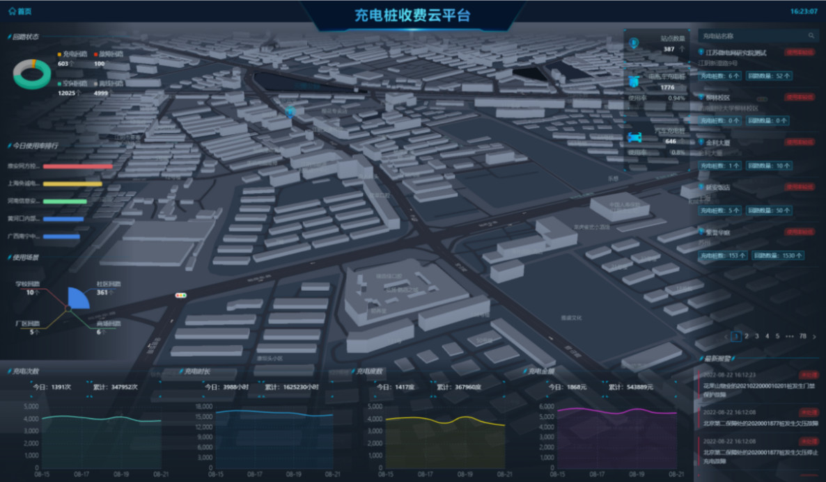 智能化大屏展示站点分布情况,对设备状态、设备使用率、充电次数、充电时长、充电金额、充电度数、充电桩故障等进行统计显示,同时可查看每个站点的站点信息、充电桩列表、充电记录、收益、能耗、故障记录等。统一管理小区充电桩,查看设备使用率,合理分配资源。
