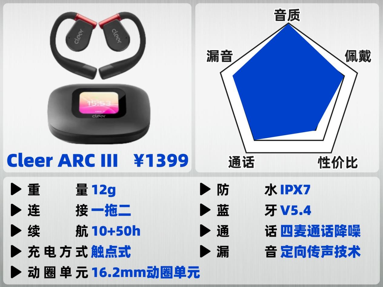 音质方面:CLEER ARC III 的音质表现堪称卓越,搭载杜比音效并支持 LDAC 解码,实现无损高清的音频传输,听感细腻通透。同时通过金标与高通骁龙双重认证,品质更有保障。配备 16.2mm 动圈单元,搭配动态低音增强技术,让低音浑厚饱满、高音清澈透亮。