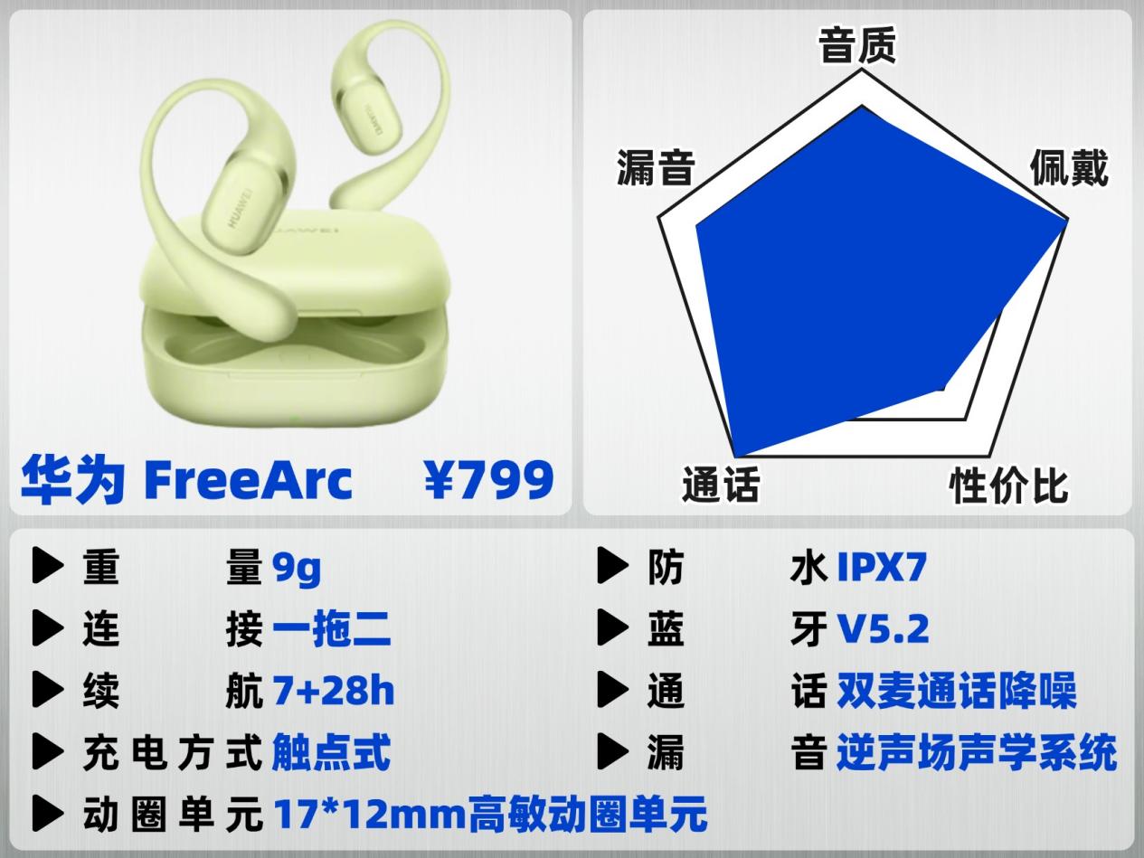 性能配置:支持蓝牙 5.2、IPX7 防水与 AI 降噪,搭配灵犀天线提升连接稳定性,这款耳机的 7+28h 续航能满足日常使用。但 799 元的定价下,蓝牙版本偏旧,续航也比同类型开放式耳机稍短,配置性价比并不突出。它更适合华为生态用户,对续航和蓝牙版本要求较高的用户需谨慎选择。