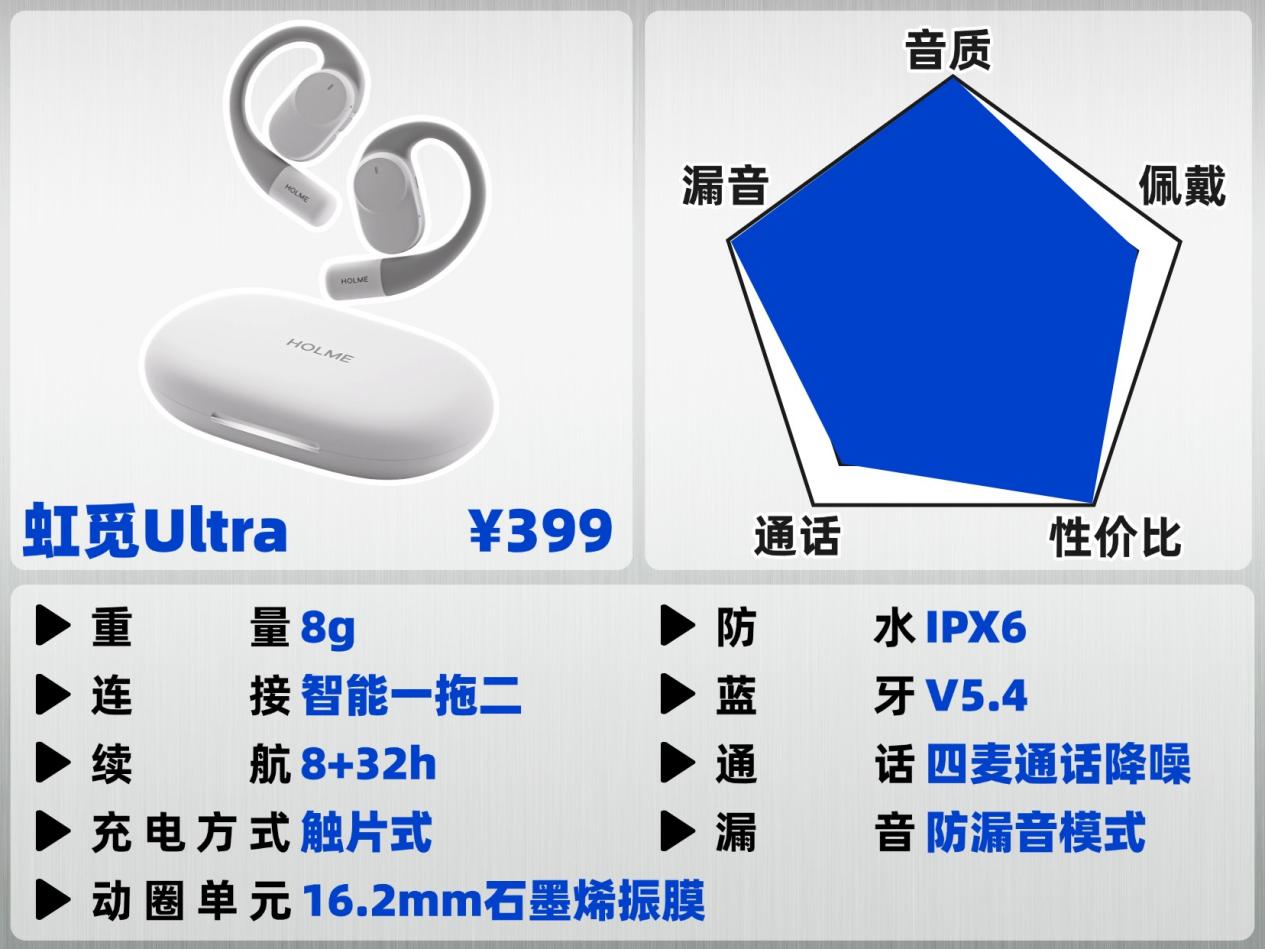 性能配置:虹觅Ultra采用的是创新的触片式充电,改良了传统触点式充电方式的接触不良,回仓不断连,充电慢的问题。为了解决开放式耳机的漏音问题,耳机还加入了专属防漏音功能,开启功能后可以明显地降低漏音外泄的问题。配置上拥有蓝牙5.4芯片,内置四麦高清麦克风,支持ENC通话降噪,支持IPX6级防水,智能一拖二,单耳续航8小时,综合续航32小时。可以说是目前500元以下的怪物级别的配置。