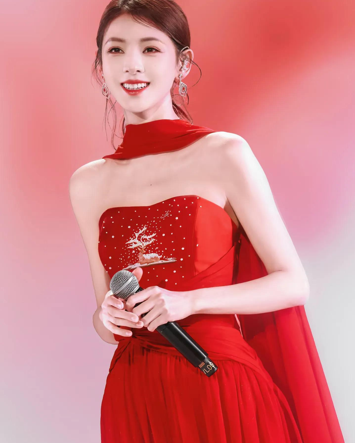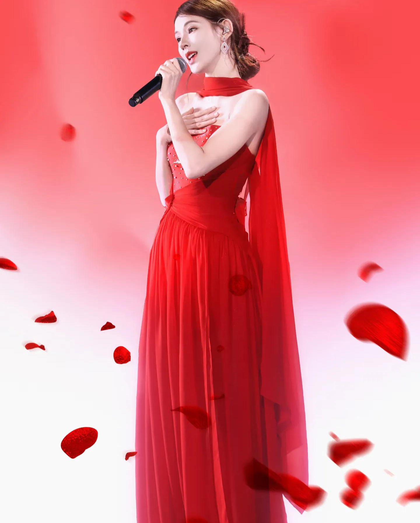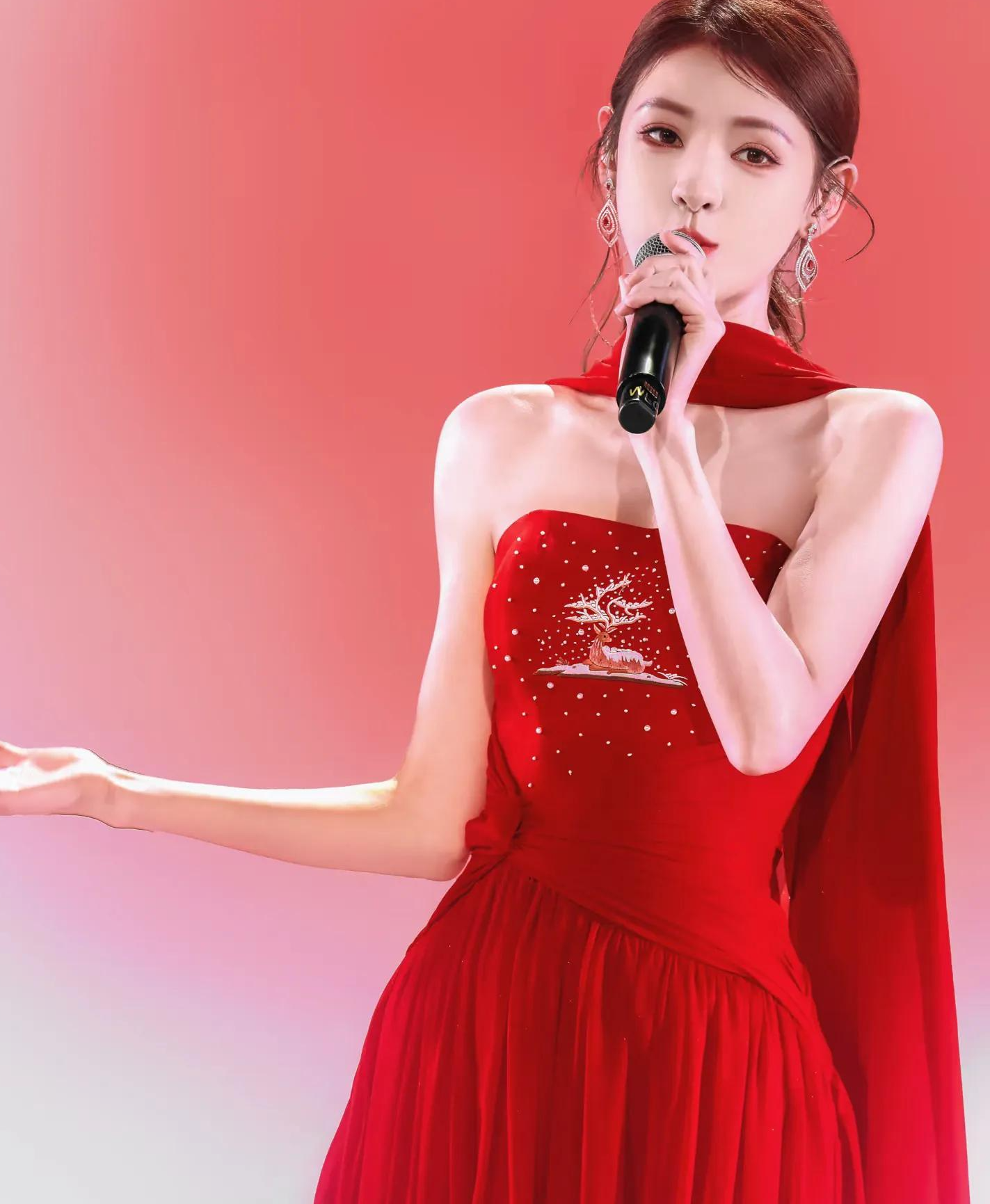 镜头拉近,裙身点缀的细闪与精致刺绣清晰可见,妆容明艳大气,红唇配红裙,眉眼间尽是温婉与灵动。她手持话筒深情献唱,歌声温柔又有力量,气息平稳,情感饱满,完全打破了“只靠颜值”的刻板印象。